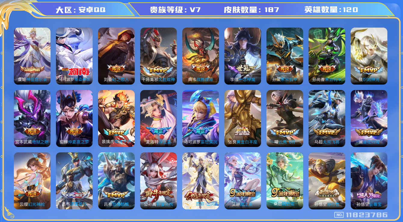 [11823786]V7 1典藏 1珍品传说 22传说 120英雄 187皮肤 可修改实名 优质装备:神鉴启示录,怪盗基德,云鹰飞将(小将军),黄金白羊座,久胜战神,炽阳神光,一念神魔,末日机甲-孙尚香(绿蚂蚱),仲夏夜之梦(大飞蛾),地狱之眼,时之恋人-刘备(电焊工),末日机甲-孙策,无双飞将,浮生妄,妄想实况,澜逐花归海 传说皮:典韦战鼓燎原,祥瑞亨通,幻光神枪 限定皮:愿照·九州拓(澜年限),愿照·山河定(司空震年限),逐霄战戟,陌上桑,鸣野蒿,至尊宝,时之彼端,怒海麟威,祈雪灵祝(雪兔子),孙行者 史诗皮:鸭鸭历险记-刘禅,化蝶舞,星界战将,谪仙醉月,龙之律动,茶境仙,怒海争锋,破空之剑,战舞者,东方月初,芈月浮光幕影,决胜骁骑,百相守梦-百里守约,紫霞仙子,千年之狐,永昼,猫狗日记-大乔,时之恋人-孙尚香,节奏热浪,女仆咖啡,水果甜心,星夜王子,心灵骇客,功夫厨神,德古拉伯爵,暗隐猎兽者,幽灵船长,鬼剑武藏,暗渊魔法,舞动绿茵,乘风破浪,逐浪之夏,水晶猎龙者,曙光守护者,箭羽风息,原初追逐者,圣诞恋歌,鹰眼统帅