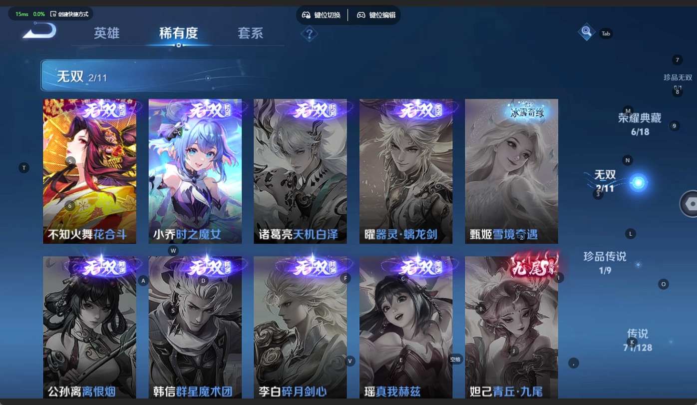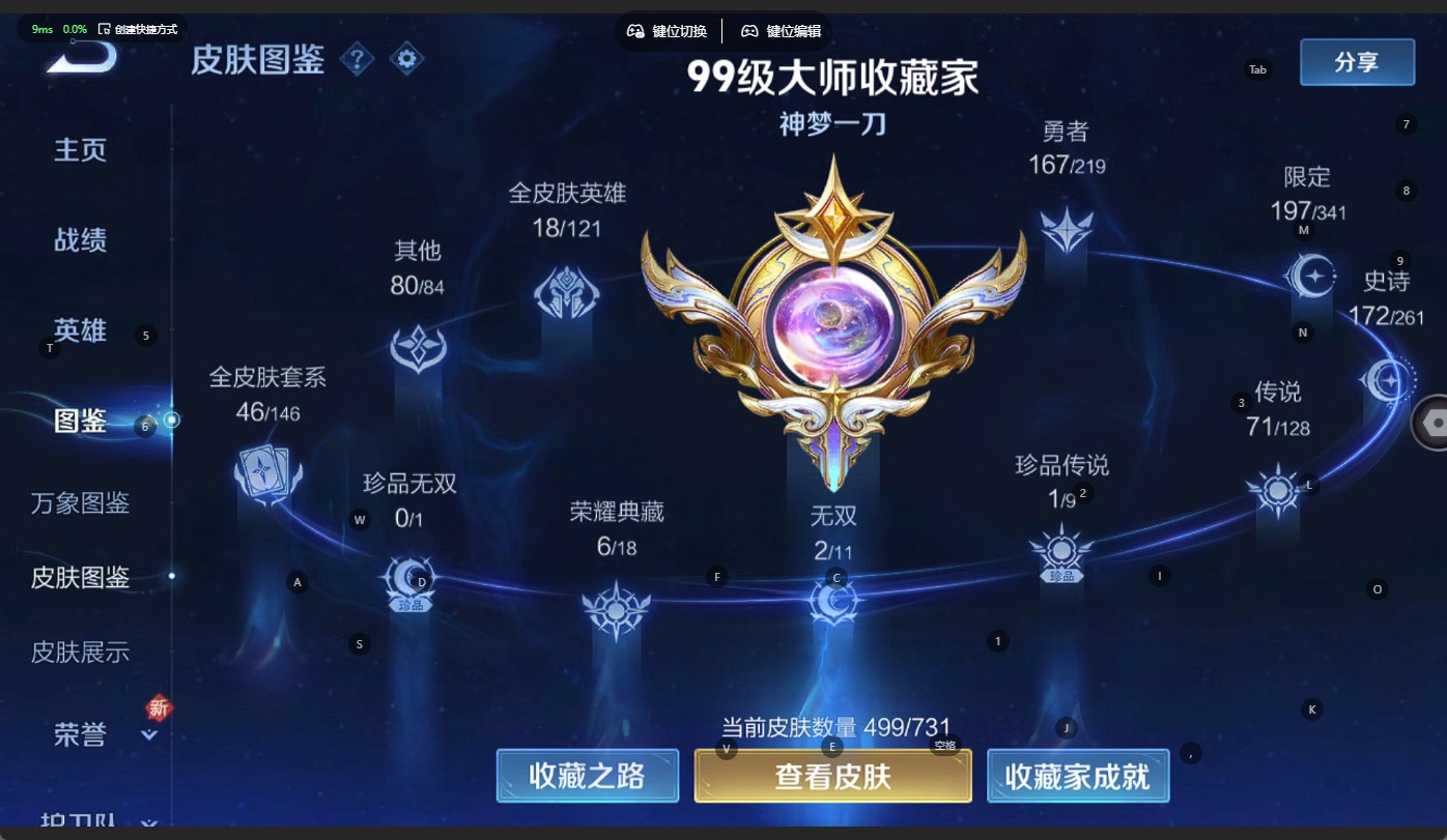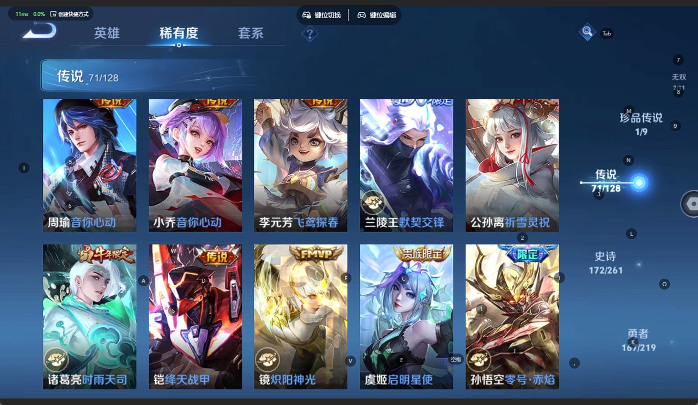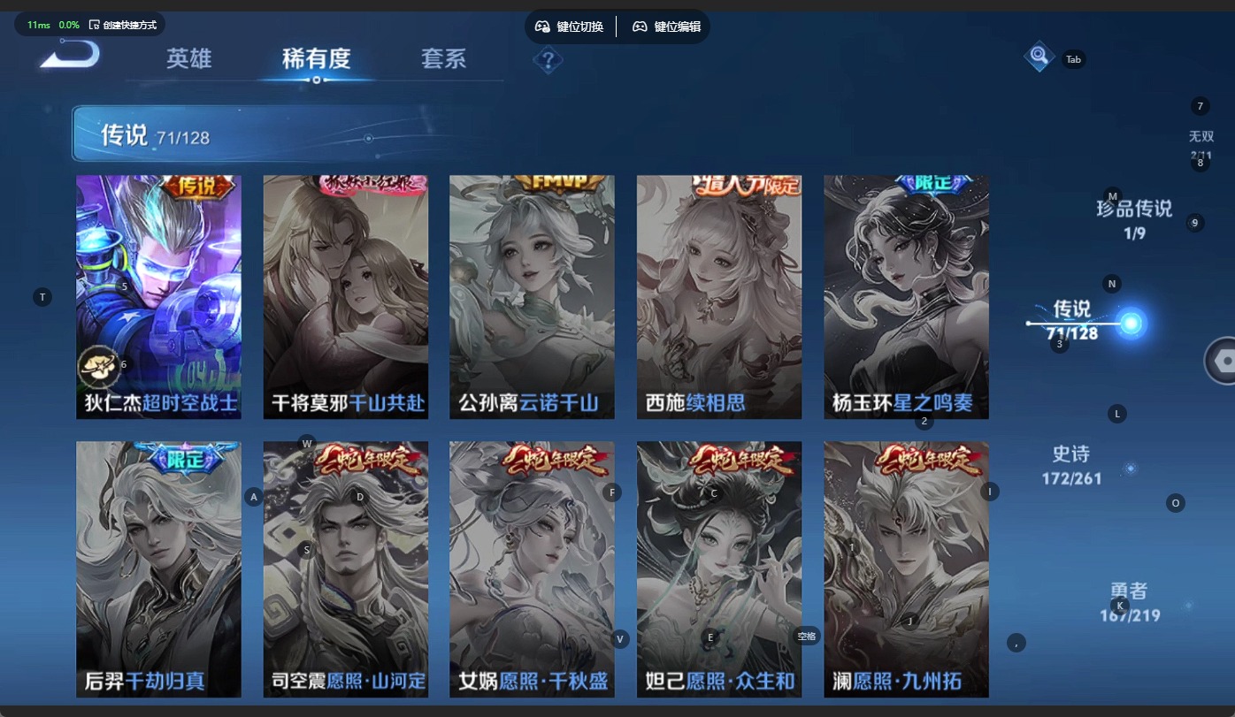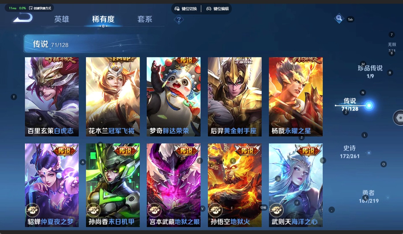 - [11713994]猴子典藏,久胜,紫霞,-可二次-108英雄-165皮肤-1典藏-7传说-31史诗 辉光之辰-后羿 街头霸王-韩信