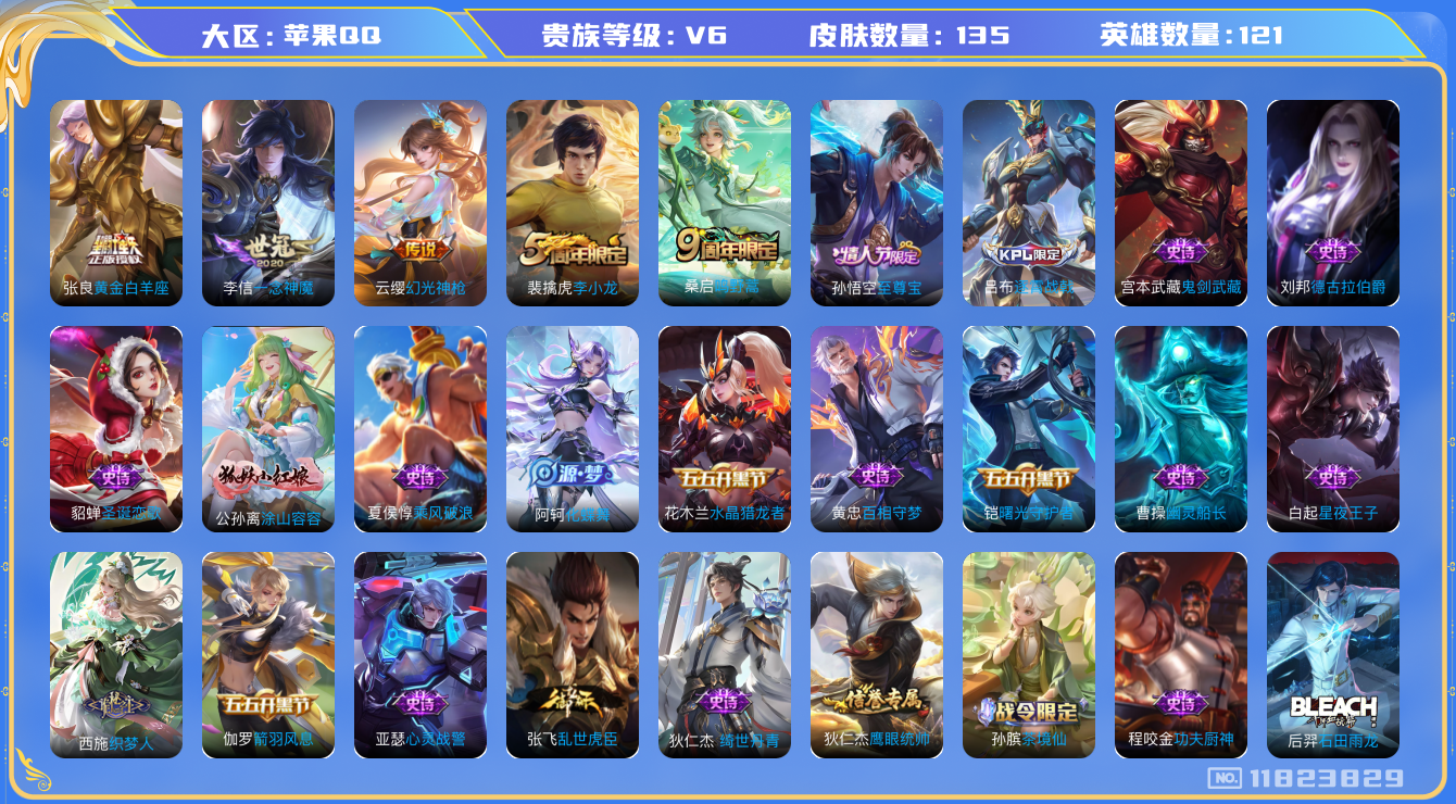 [11823829]V6 4传说 121英雄 135皮肤 可修改实名 优质装备:黄金白羊座,一念神魔,涂山容容 传说皮:幻光神枪 珍宝阁皮:妄想食味 限定皮:逐霄战戟,鸣野蒿,至尊宝,李小龙 史诗皮:鸭鸭历险记-刘禅,绮世丹青,化蝶舞,龙之律动,石田雨龙,百相守梦-周瑜,茶境仙,百相守梦-百里守约,百相守梦-黄忠,织梦人,紫霞仙子,特工魅影,江河有灵,魅语,冰冠公主,偶像歌手,末日机甲-吕布,乱世虎臣,女仆咖啡,水果甜心,星夜王子,功夫厨神,德古拉伯爵,幽灵船长,鬼剑武藏,心灵战警,乐园奇幻夜,纤云弄巧,乘风破浪,逐浪之夏,水晶猎龙者,曙光守护者,箭羽风息,圣诞狂欢,圣诞恋歌,鹰眼统帅,魅力维加斯