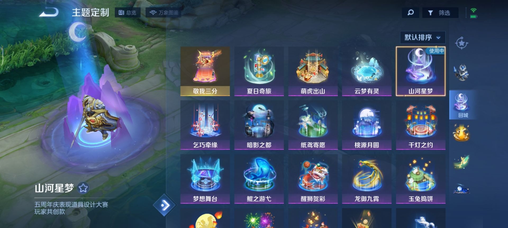 夏侯惇朔风刀,老夫子醍醐杖,沈梦溪大漠名商,盾山御銮,曹操烛龙,苏烈千军破阵,典韦穷奇,达摩沙漠行僧,牛魔御旌,鲁班七号狮舞东方,吕布猎兽之王,兰陵王金庭之子,裴擒虎擒涛扼浪,鲁班大师探海日志,明世隐疑决卦,马可波罗暗影游猎,白起狰,鬼谷子原初探秘者,张良古海寻踪,桑启海盐诗旅,狄仁杰万华元夜,嬴政白昼王子,芈月重明,程咬金演武夺筹,弈星混沌棋,虞姬凯尔特女王,米莱狄御霄,钟馗神迹守卫,钟馗驱傩正仪,狂铁御狮,太乙真人饕餮