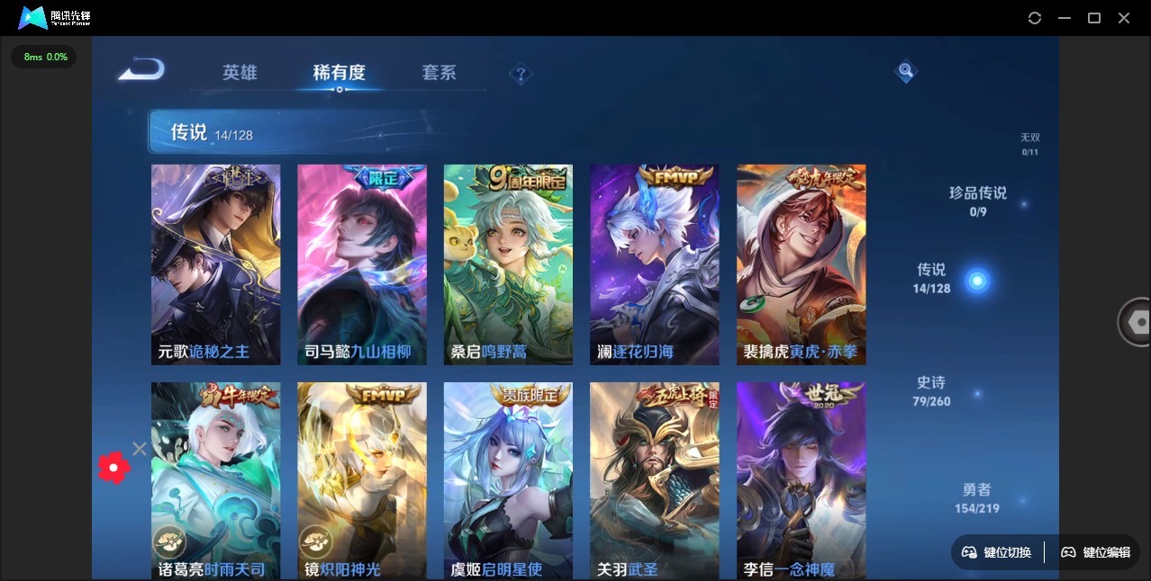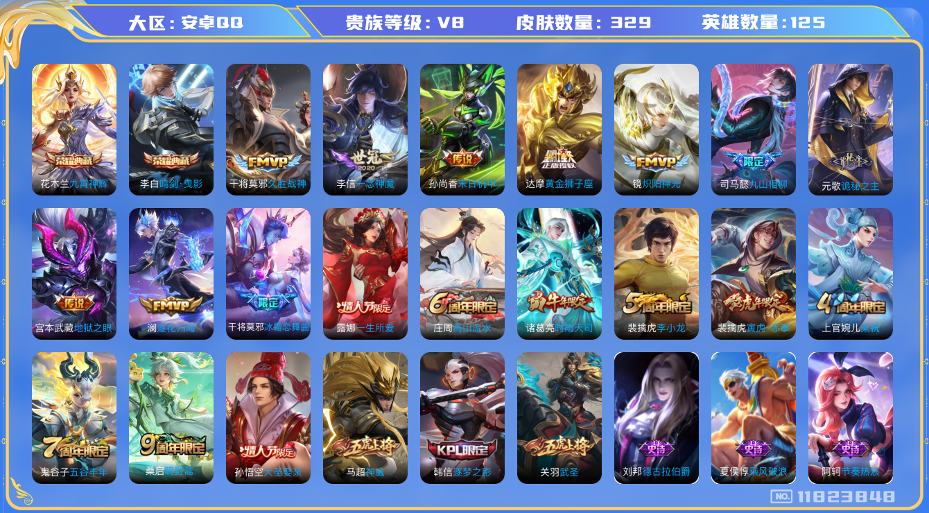 [11823848]V8 2典藏 14传说 125英雄 329皮肤 可修改实名 优质装备:鸣剑·曳影,九霄神辉(木兰典藏),黄金狮子座,久胜战神,炽阳神光,一念神魔,末日机甲-孙尚香(绿蚂蚱),地狱之眼,澜逐花归海,诡秘之主,涂山容容 传说皮:九山相柳 珍宝阁皮:妄想食味,胡桃夹子,女武神 限定皮:鸣野蒿,时雨天司(水龙头),神威(电光马子),高山流水,五谷丰年,武圣,梁祝,李小龙,逐梦之影,一生所爱,大圣娶亲,冰霜恋舞曲,寅虎·赤拳(老虎年限) 史诗皮:赞萌露比,鸭鸭历险记-刘禅,星界战将,龙之律动,百相守梦-周瑜,百相守梦-黄忠,紫霞仙子,白龙吟,特工魅影,千年之狐,永昼,江河有灵,魅语,蒙恬荣光圣徽,无限星赏官,冰冠公主,猫狗日记-孙策,乱世虎臣,节奏热浪,修罗,女仆咖啡,摇滚巨星,水果甜心,绅士熊喵,天才门将,星夜王子,心灵骇客,功夫厨神,德古拉伯爵,暗隐猎兽者,幽灵船长,鬼剑武藏,心灵战警,乐园奇幻夜,舞动绿茵,地狱岩魂,纤云弄巧,繁星吟游(呼啦呼啦),拒霜思,缤纷独角兽,乘风破浪,逐浪之夏,月团寄思,水晶猎龙者,曙光守护者,箭羽风息,金属风暴,原初追逐者,圣诞狂欢,圣诞恋歌,鹰眼统帅,黎明之约,赏金猎手,滕王阁序,无心,未来纪元-赵云