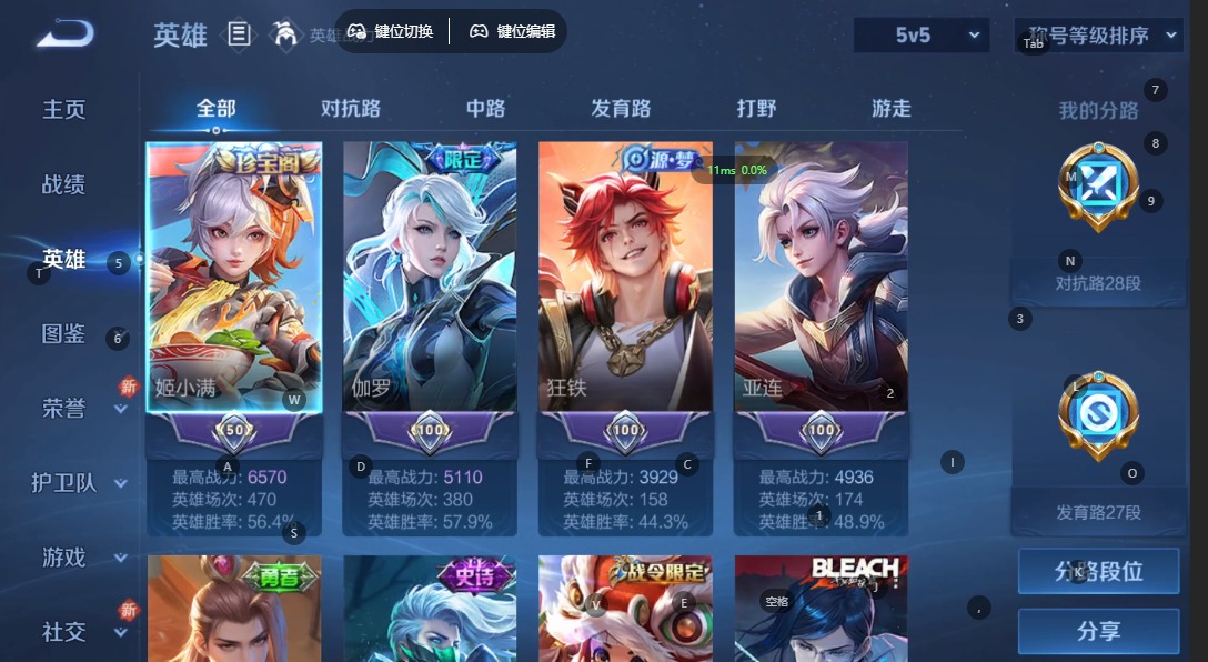 - [11764288]V4 1典藏 2传说 122英雄 126皮肤 可修改实名 优质装备:弑枪猎影(韩信典藏) 传说皮:幻光神枪 珍宝阁皮:蔷薇恋人 限定皮:逐霄战戟,鸣野蒿,五谷丰年,游园惊梦,孙行者 史诗皮:百相守梦-黄忠,紫霞仙子,千年之狐,江河有灵,百解令(蒙犽),电玩·爆裂旋风,末日机甲-吕布,乱世虎臣,节奏热浪,女仆咖啡,水果甜心,天才门将,德古拉伯爵,暗隐猎兽者,鬼剑武藏,乘风破浪,水晶猎龙者,金属风暴,圣诞恋歌,鹰眼统帅,魅力维加斯,无心,未来纪元-赵云