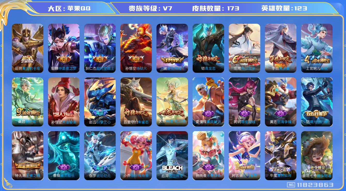 [11823863]V7 7传说 123英雄 173皮肤 可修改实名 优质装备:黄金射手座,地狱火,仲夏夜之梦(大飞蛾),超时空战士-狄仁杰,澜逐花归海 珍宝阁皮:妄想食味 限定皮:鸣野蒿,凤求凰(白切鸡),高山流水,青龙志(铠年限),梁祝,朱雀志(守约年限),大圣娶亲,引擎之心 史诗皮:星界战将,龙之律动,石田雨龙,怒海争锋,琥珀纪元伽罗,蔬乡物语(鲁班七号),乘龙·忆丹青(大乔年限),紫霞仙子,白龙吟,黄金分割率,特工魅影,千年之狐,江河有灵,蒙恬荣光圣徽,冰冠公主,电玩·爆裂旋风,暗夜猫娘,女仆咖啡,水果甜心,绅士熊喵,天才门将,功夫厨神,暗隐猎兽者,幽灵船长,舞动绿茵,纤云弄巧,缤纷独角兽,乘风破浪,逐浪之夏,水晶猎龙者,曙光守护者,金属风暴,圣诞狂欢,圣诞恋歌,鹰眼统帅,王者之锤,魅力维加斯