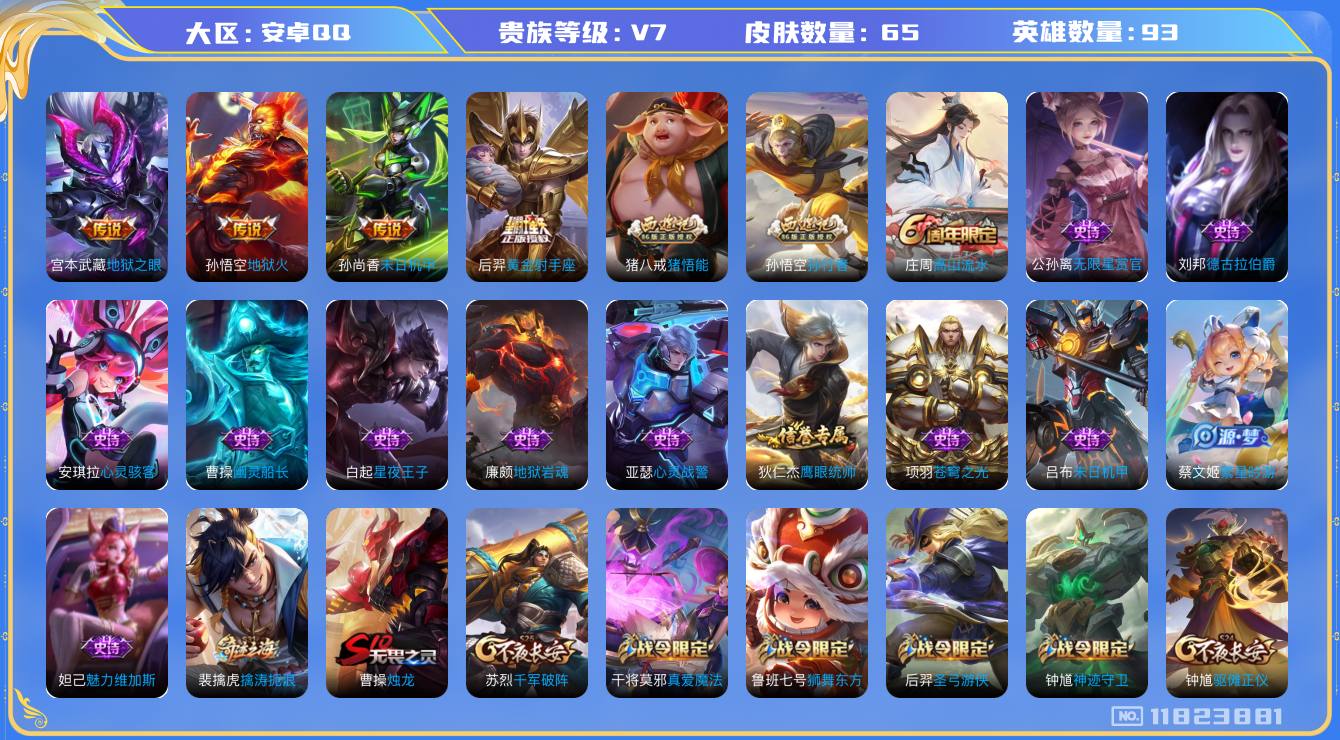 [11823881]V7 4传说 93英雄 65皮肤 可修改实名 优质装备:黄金射手座,末日机甲-孙尚香(绿蚂蚱),地狱火,地狱之眼 限定皮:高山流水,孙行者,猪悟能 史诗皮:苍穹之光,无限星赏官,末日机甲-吕布,星夜王子,心灵骇客,德古拉伯爵,幽灵船长,心灵战警,地狱岩魂,繁星吟游(呼啦呼啦),鹰眼统帅,魅力维加斯