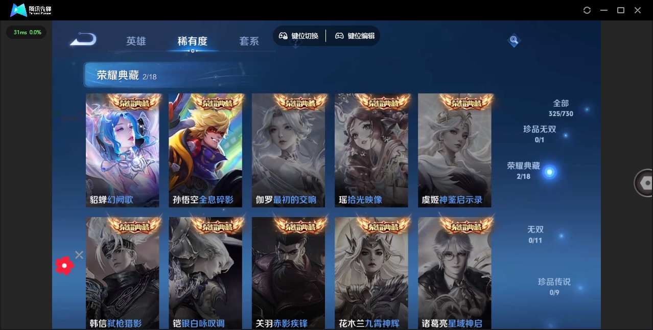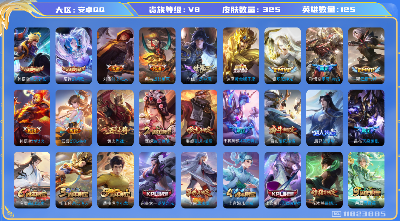 [11823885]V8 2典藏 14传说 125英雄 325皮肤 可修改实名 优质装备:全息碎影(猴子典藏),幻阙歌(貂蝉典藏),黄金狮子座,云鹰飞将(小将军),炽阳神光,一念神魔,地狱火,零号·赤焰,时之恋人-刘备(电焊工) 传说皮:典韦战鼓燎原,幻光神枪 珍宝阁皮:优雅恋人,女武神 限定皮:鸣野蒿,至尊宝,白虎志(电光耗子),凤求凰(白切鸡),白晶晶,神威(电光马子),飞衡(韩信年限),瑞麟志(木兰年限),遇见飞天,高山流水,冰锋战神,游园惊梦,梁祝,御风骁将(吕布年限),烈魂,天狼绘梦者,李小龙,逐梦之光,朱雀志(守约年限),如梦令-嫦娥,如梦令-后羿,霸王别姬-虞姬,猪悟能,大圣娶亲,引擎之心,天魔缭乱,冰霜恋舞曲,美猴王,寅虎·御盾(廉颇年限) 史诗皮:龙之律动,石田雨龙,东方月初,百相守梦-黄忠,紫霞仙子,黄金分割率,永昼,江河有灵,鹤归松栖(赵怀真),蒙恬荣光圣徽,冰冠公主,晚萤,暗夜猫娘,龙骑士(小龙虾),末日机甲-吕布,猫狗日记-孙策,乱世虎臣,节奏热浪,修罗,女仆咖啡,摇滚巨星,水果甜心,绅士熊喵,天才门将,星夜王子,心灵骇客,功夫厨神,德古拉伯爵,暗隐猎兽者,幽灵船长,鬼剑武藏,心灵战警,舞动绿茵,纤云弄巧,繁星吟游(呼啦呼啦),缤纷独角兽,乘风破浪,逐浪之夏,水晶猎龙者,曙光守护者,箭羽风息,金属风暴,原初追逐者,圣诞狂欢,圣诞恋歌,鹰眼统帅,王者之锤,暗夜贵公子,魅力维加斯,黎明之约,赏金猎手,寅虎·御盾,无心,未来纪元-赵云