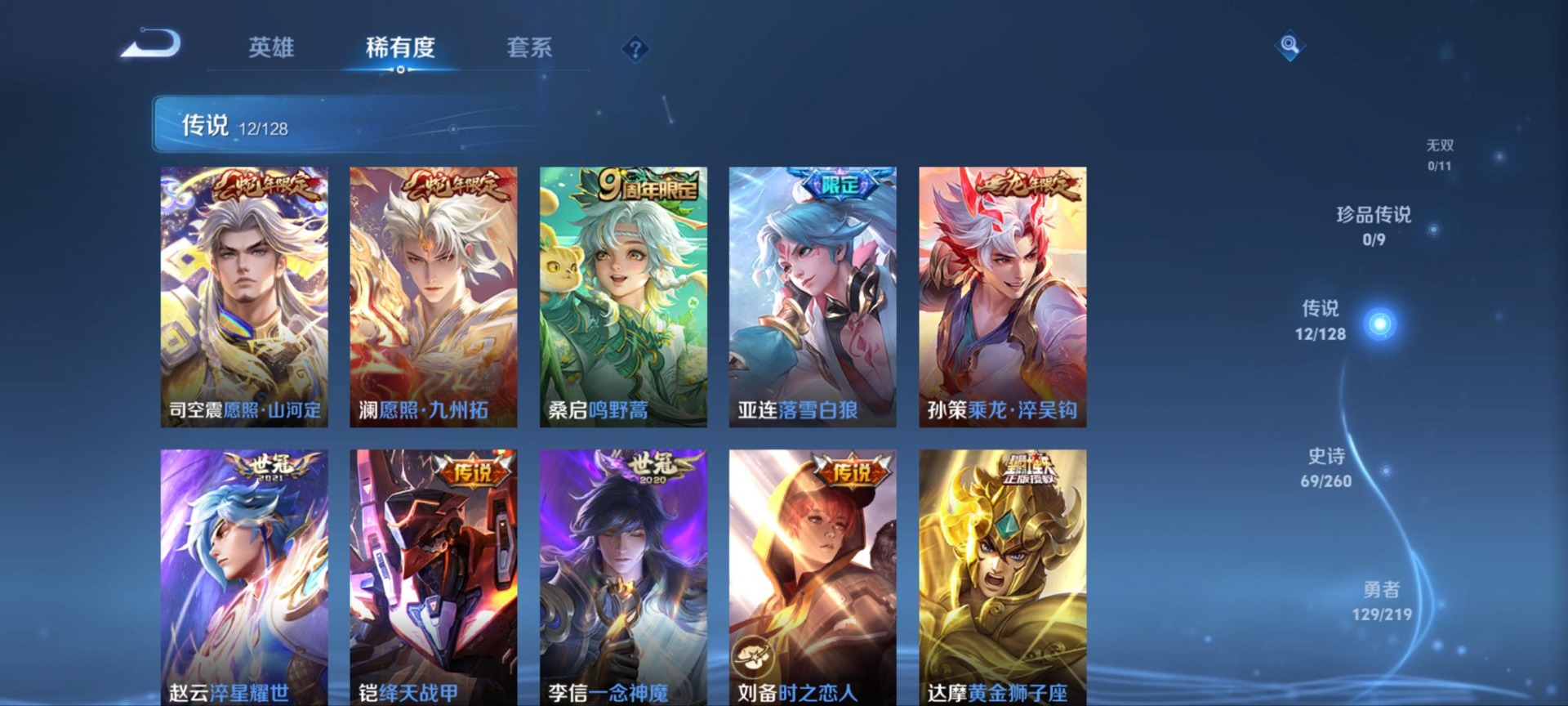 - [11681473]V7 1典藏 6传说 122英雄 229皮肤 可修改实名 荣耀水晶:鸣剑·曳影 传说皮:地狱之眼,云鹰飞将(小将军),炽阳神光 珍宝阁皮:妄想食味,蔷薇恋人,女武神 限定皮:鸣野蒿,白虎志(电光耗子),高山流水,五谷丰年,游园惊梦,梁祝,天狼狩猎者,祈雪灵祝(雪兔子),李小龙,默契交锋-花木兰,山海·玄木吟(马可年限) 史诗皮:星界战将,蒙犽顽岩魄,超元猎域,电玩小子(小书包),黄金分割率,特工魅影,千年之狐,江河有灵,蒙恬荣光圣徽,冰冠公主,偶像歌手,魅语,电玩·爆裂旋风,暗夜猫娘,末日机甲-吕布,猫狗日记-孙策,猫狗日记-大乔,时之恋人-孙尚香,节奏热浪,修罗,女仆咖啡,水果甜心,绅士熊喵,星夜王子,暗隐猎兽者,幽灵船长,鬼剑武藏,舞动绿茵,纤云弄巧,繁星吟游(呼啦呼啦),拒霜思,缤纷独角兽,乘风破浪,逐浪之夏,水晶猎龙者,曙光守护者,热力回旋,箭羽风息,金属风暴,原初追逐者,圣诞狂欢,圣诞恋歌,鹰眼统帅,黎明之约,赏金猎手,无心,未来纪元-赵云