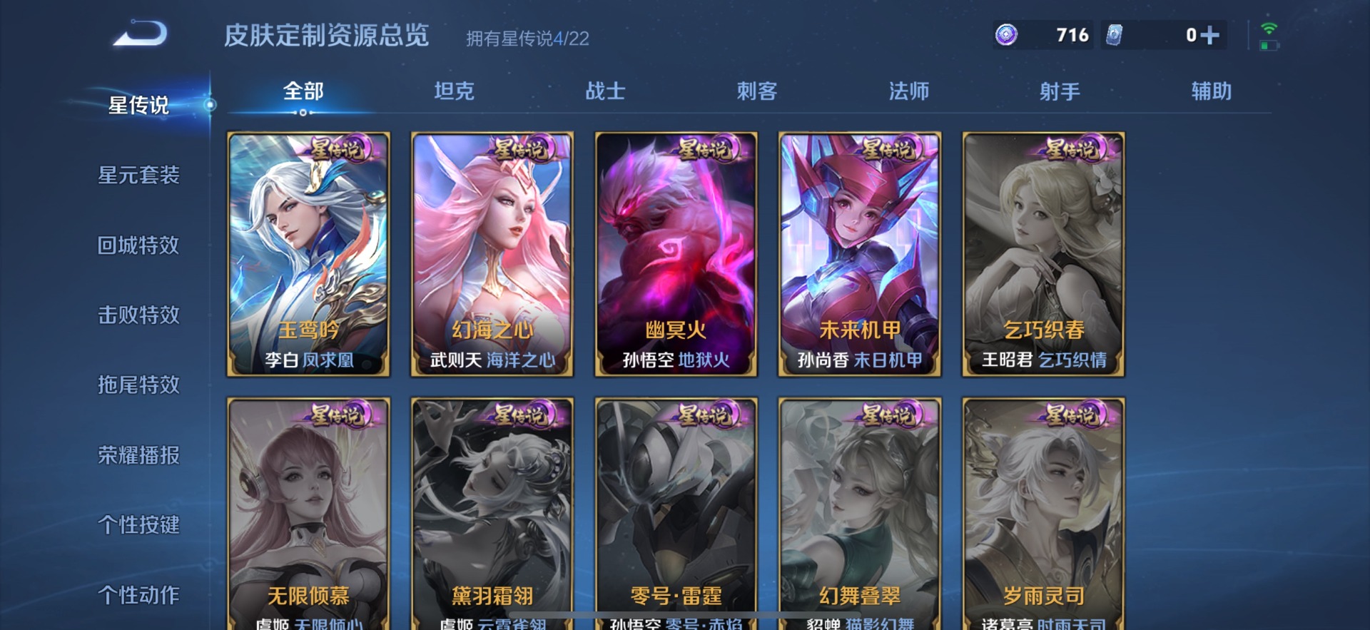 干将莫邪冰霜恋舞曲,小乔纯白花嫁,鲁班七号乒乒小将,裴擒虎李小龙,上官婉儿梁祝,李白诗剑行,花木兰青春决赛季,马可波罗逐梦之星,孙悟空大圣娶亲,孙悟空至尊宝,赵云引擎之心,韩信飞衡,百里守约朱雀志,王昭君凤凰于飞,关羽冰锋战神