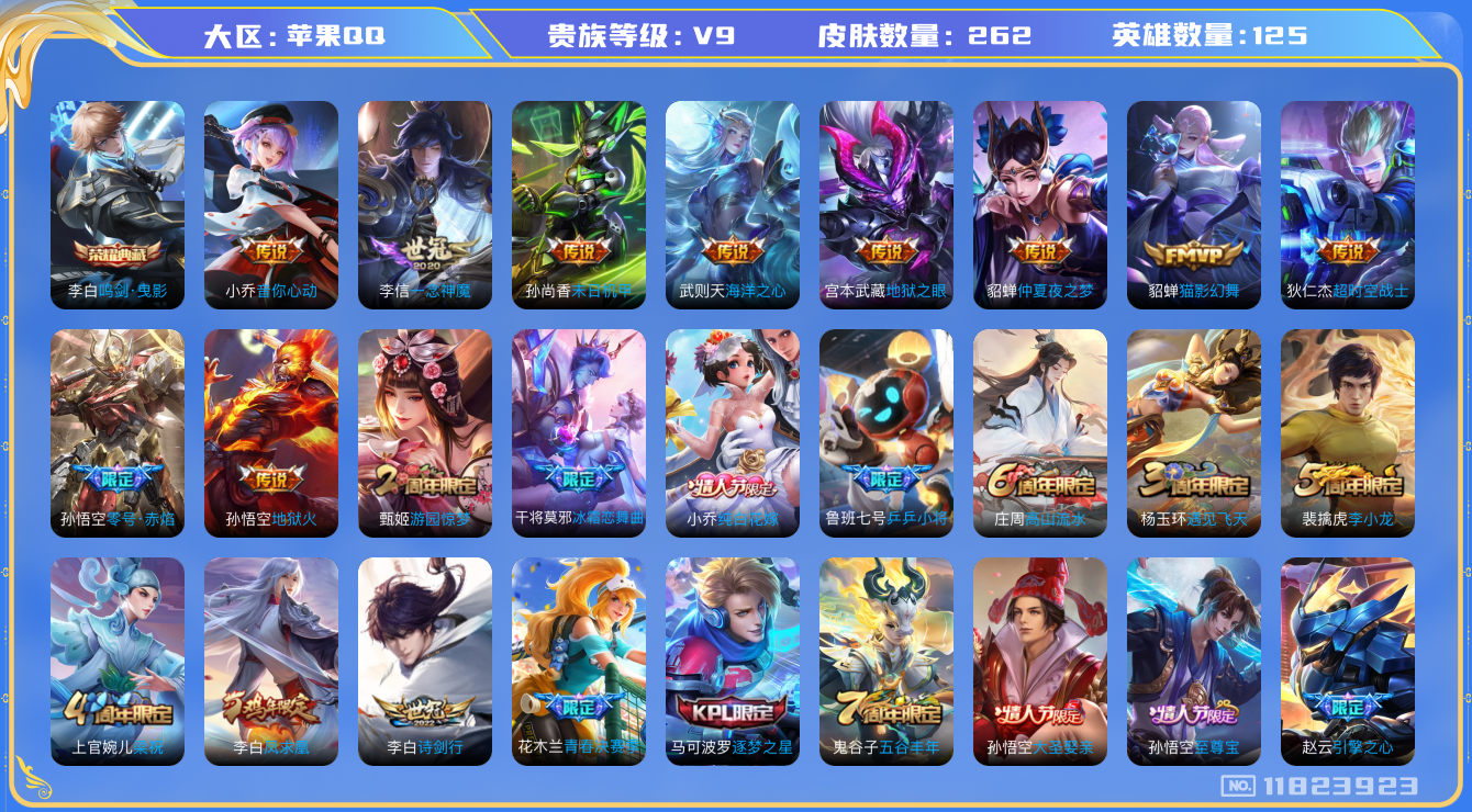 [11823923]V9 1典藏 13传说 125英雄 262皮肤 典藏英雄武则天 可修改实名 优质装备:鸣剑·曳影,猫影幻舞,一念神魔,末日机甲-孙尚香(绿蚂蚱),地狱火,仲夏夜之梦(大飞蛾),音你心动-小乔,零号·赤焰,海洋之心,地狱之眼,超时空战士-狄仁杰 珍宝阁皮:优雅恋人 限定皮:至尊宝,凤求凰(白切鸡),凤凰于飞,飞衡(韩信年限),遇见飞天,高山流水,诗剑行,五谷丰年,冰锋战神,游园惊梦,梁祝,逐梦之星,李小龙,朱雀志(守约年限),纯白花嫁,大圣娶亲,引擎之心,青春决赛季,冰霜恋舞曲,乒乒小将 史诗皮:紫霞仙子,白龙吟,黄金分割率,千年之狐,永昼,无限星赏官,冰冠公主,偶像歌手,暗夜猫娘,修罗,摇滚巨星,水果甜心,绅士熊喵,星夜王子,心灵骇客,功夫厨神,暗隐猎兽者,幽灵船长,鬼剑武藏,心灵战警,天秀·启明,地狱岩魂,诗语江南,繁星吟游(呼啦呼啦),缤纷独角兽,乘风破浪,逐浪之夏,箭羽风息,金属风暴,原初追逐者,圣诞狂欢,圣诞恋歌,鹰眼统帅,暗夜贵公子,魅力维加斯,无心,未来纪元-赵云