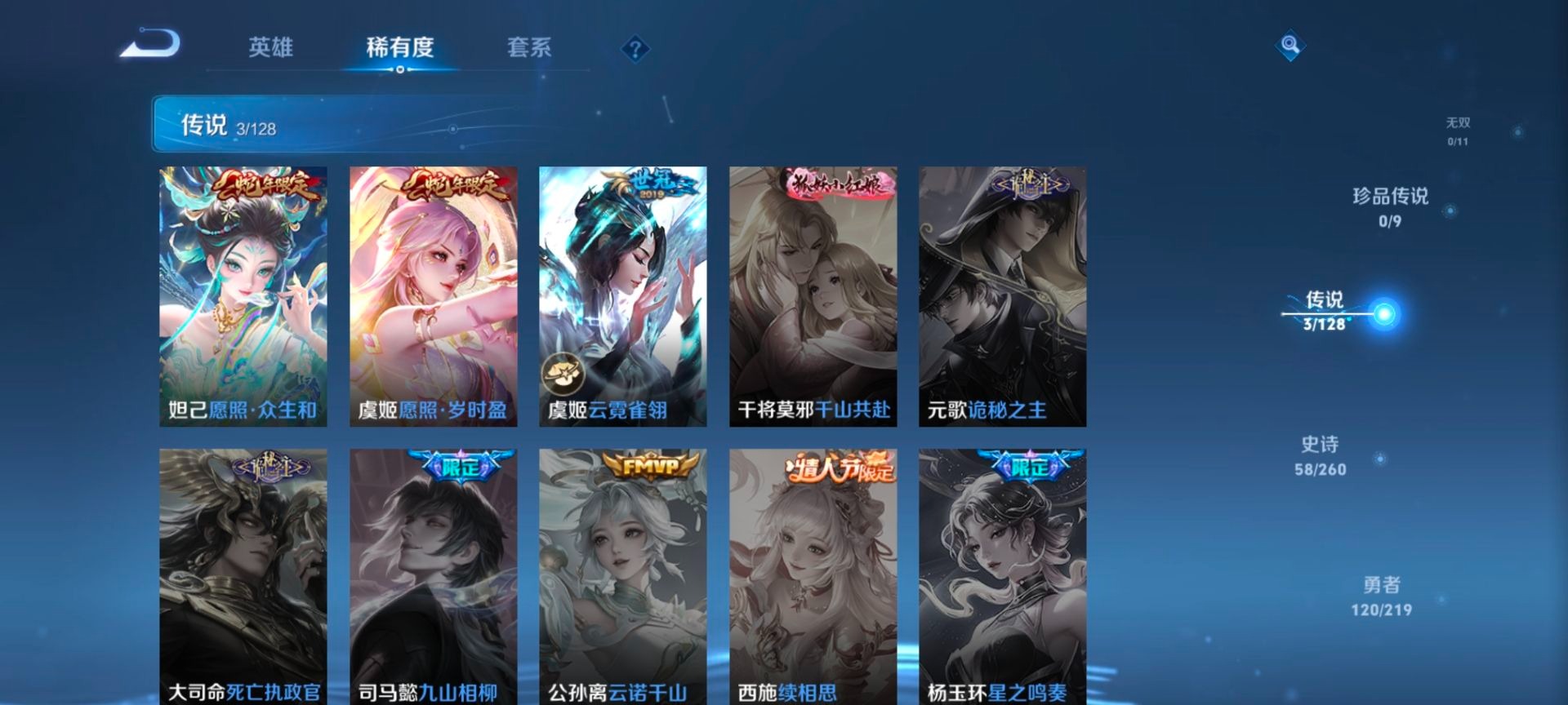 [11823941]V7 3传说 123英雄 226皮肤 可修改实名 优质装备:云霓雀翎 珍宝阁皮:优雅恋人,蔷薇恋人 限定皮:愿照·岁时盈(虞姬年限),愿照·众生和(妲己年限),至尊宝,傲雪梅枪,遇见飞天,高山流水,五谷丰年,岱宗(典韦年限),逐梦之音,李小龙,猪悟能 史诗皮:鸭鸭历险记-刘禅,化蝶舞,龙之律动,石田雨龙,茶境仙,怒海争锋,遇见神鹿,白龙吟,特工魅影,江河有灵,高渐离燃音魔法,偶像歌手,龙骑士(小龙虾),末日机甲-吕布,猫狗日记-孙策,猫狗日记-大乔,女仆咖啡,水果甜心,绅士熊喵,心灵骇客,功夫厨神,鬼剑武藏,纤云弄巧,繁星吟游(呼啦呼啦),拒霜思,缤纷独角兽,逐浪之夏,曙光守护者,唤灵魅影,原初追逐者,圣诞狂欢,圣诞恋歌,鹰眼统帅,魅力维加斯,黎明之约,未来纪元-赵云