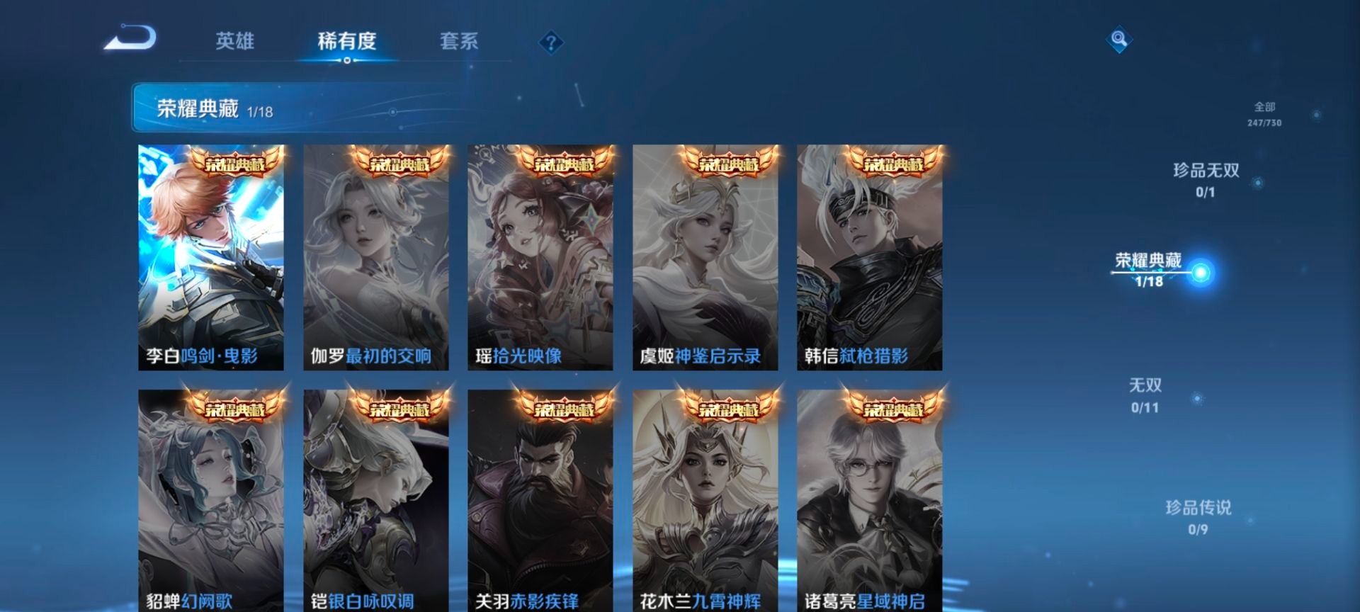 刘邦夺宝奇兵,夏侯惇朔风刀,老夫子醍醐杖,沈梦溪星空之诺,沈梦溪大漠名商,盾山御銮,苏烈千军破阵,典韦蓝屏警告,达摩沙漠行僧,牛魔御旌,元歌云间偶戏,兰陵王金庭之子,裴擒虎擒涛扼浪,鲁班大师探海日志,明世隐疑决卦,蒙犽狂想玩偶喵,马可波罗暗影游猎,鬼谷子原初探秘者,张良古海寻踪,女娲朔望之晖,桑启海盐诗旅,狄仁杰万华元夜,程咬金演武夺筹,李元芳银河之约,李元芳云中旅人,弈星混沌棋,米莱狄御霄,钟馗神迹守卫,钟馗驱傩正仪,狂铁御狮