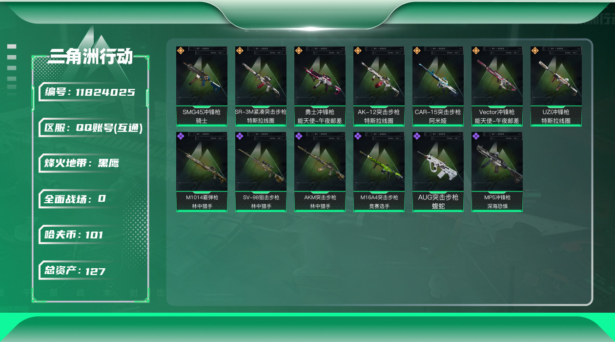 [11824025]总资产:127.4M 7传说枪械 哈夫币:101K 可二次 可修改实名 烽火地带段位:黑鹰 全面战场段位:无段位 传说武器皮肤:SMG45冲锋枪-骑士,AK-12突击步枪-特斯拉线圈,CAR-15突击步枪-阿米娅,SR-3M紧凑突击步枪-特斯拉线圈,UZI冲锋枪-特斯拉线圈,勇士冲锋枪-能天使-午夜邮差,Vector冲锋枪-能天使-午夜邮差 史诗武器皮肤:AUG突击步枪-蝮蛇,M16A4突击步枪-竞赛选手,M1014霰弹枪-林中猎手,MP5冲锋枪-深海恐惧,AKM突击步枪-林中猎手,SV-98狙击步枪-林中猎手