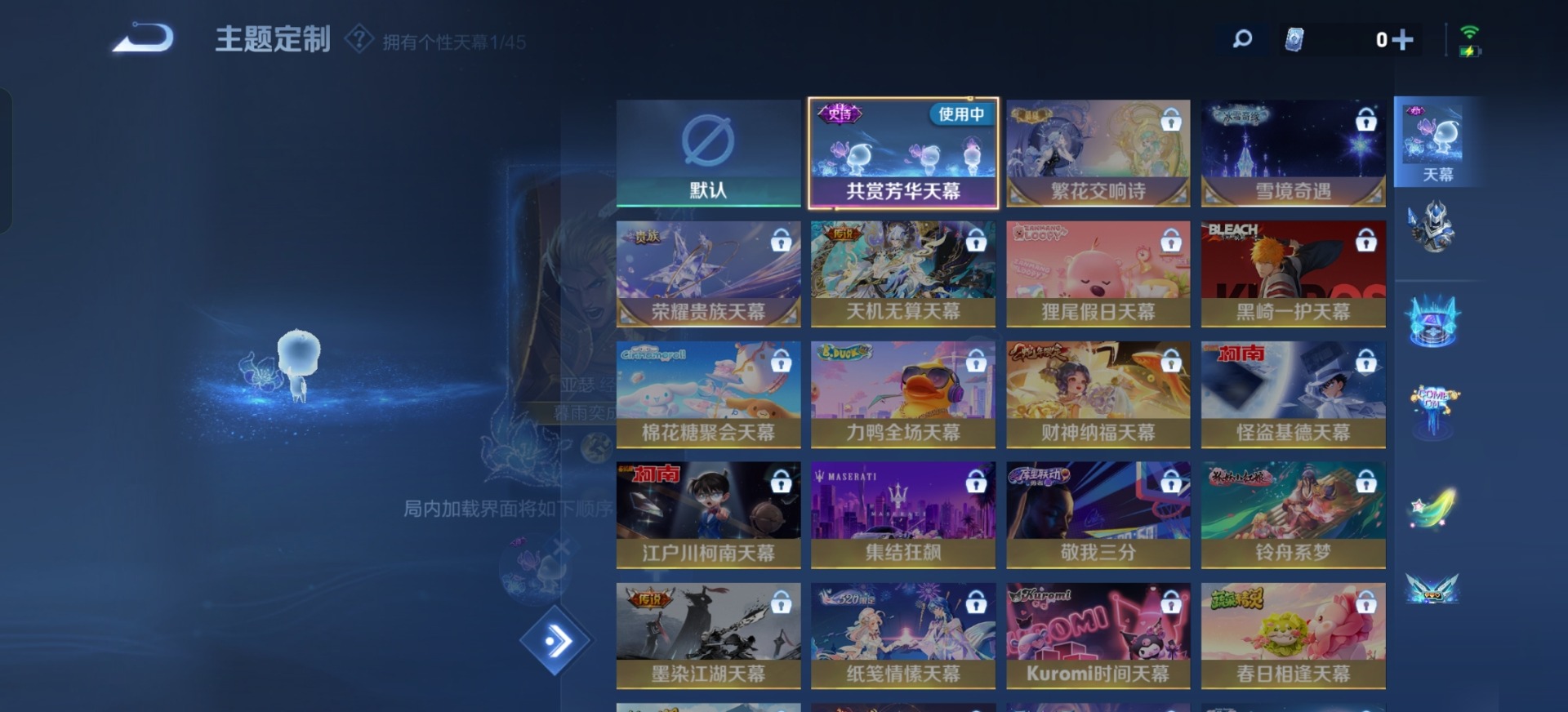 铠青龙志,典韦岱宗,孙尚香异界灵契,吕布御风骁将,裴擒虎李小龙,上官婉儿梁祝,花木兰默契交锋,花木兰瑞麟志,马可波罗山海·玄木吟,桑启鸣野蒿,猪八戒猪悟能,孙悟空孙行者,芈月白晶晶,韩信飞衡,橘右京枫霜尽
