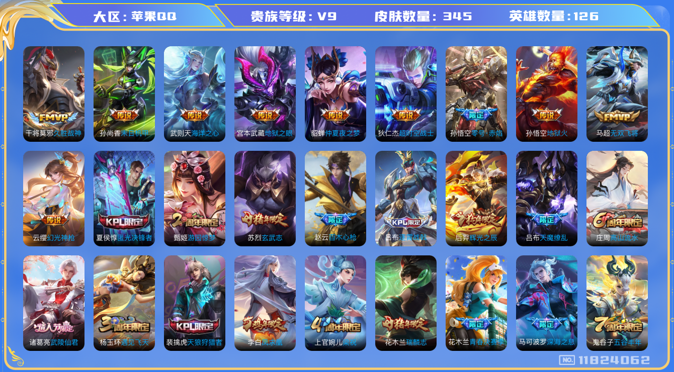 [11824062]V9 18传说 126英雄 345皮肤 典藏英雄武则天 可修改实名 优质装备:久胜战神,末日机甲-孙尚香(绿蚂蚱),地狱火,仲夏夜之梦(大飞蛾),零号·赤焰,海洋之心,地狱之眼,超时空战士-狄仁杰,无双飞将 传说皮:幻光神枪 珍宝阁皮:万物之道,蔷薇恋人 限定皮:逐霄战戟,鸣野蒿,至尊宝,凤求凰(白切鸡),凤凰于飞,武陵仙君(小桃花),傲雪梅枪,瑞麟志(木兰年限),遇见飞天,高山流水,匿光决锋者,五谷丰年,冰锋战神,武圣,游园惊梦,梁祝,天狼狩猎者,逐梦之影,玄武志(苏烈年限),朱雀志(守约年限),辉光之辰,猪悟能,天魔缭乱,青春决赛季,美猴王,百木心枪,深海之息(深海大菠萝),枫霜尽 史诗皮:瑰影绮梦,化蝶舞,茶境仙,破空之剑,百相守梦-百里守约,百相守梦-黄忠,紫霞仙子,苍穹之光,电玩小子(小书包),黄金分割率,特工魅影,千年之狐,永昼,百相守梦(刘备),龙骑士(小龙虾),暗夜猫娘,晚萤,冰冠公主,青蛇,末日机甲-吕布,猫狗日记-孙策,时之恋人-孙尚香,节奏热浪,修罗,女仆咖啡,水果甜心,天才门将,星夜王子,心灵骇客,功夫厨神,德古拉伯爵,暗隐猎兽者,幽灵船长,鬼剑武藏,心灵战警,天秀·启明,舞动绿茵,地狱岩魂,纤云弄巧,繁星吟游(呼啦呼啦),拒霜思,缤纷独角兽,乘风破浪,逐浪之夏,水晶猎龙者,曙光守护者,箭羽风息,唤灵魅影,金属风暴,原初追逐者,圣诞狂欢,圣诞恋歌,鹰眼统帅,王者之锤,暗夜贵公子,魅力维加斯,黎明之约,天秀·音浪,无心,未来纪元-赵云