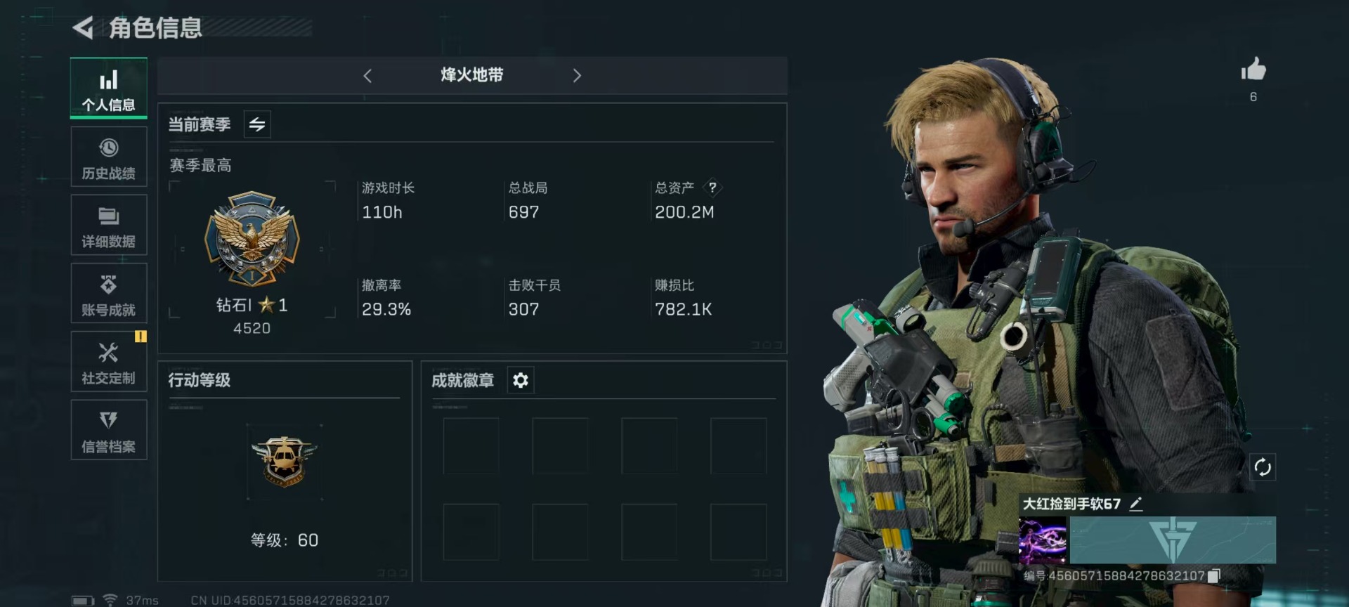- [11687937]总资产:146.9M 10传说枪械 哈夫币:33.522K 可二次 可修改实名 烽火地带段位:钻石 全面战场段位:军士长 传说武器皮肤:93R-捞点薯条,AWM狙击步枪-捞点薯条,腾龙突击步枪-捞点薯条,AK-12突击步枪-特斯拉线圈,CAR-15突击步枪-阿米娅,SR-3M紧凑突击步枪-特斯拉线圈,UZI冲锋枪-特斯拉线圈,勇士冲锋枪-能天使-午夜邮差,复合弓-黑-天际线,M4A1突击步枪-阿米娅 史诗武器皮肤:PKM通用机枪-蝮蛇,M16A4突击步枪-竞赛选手,SR-3M紧凑突击步枪-荒野求生,SV-98狙击步枪-林中猎手,M250通用机枪-囚徒,SV-98狙击步枪-囚徒,腾龙突击步枪-无垢,SVD狙击步枪-阿萨拉工艺