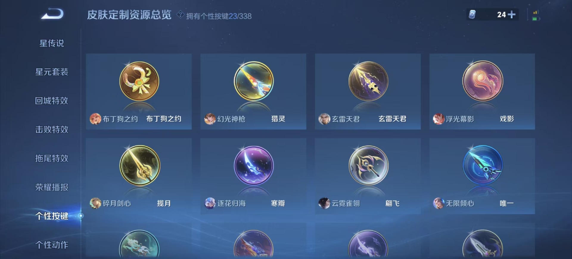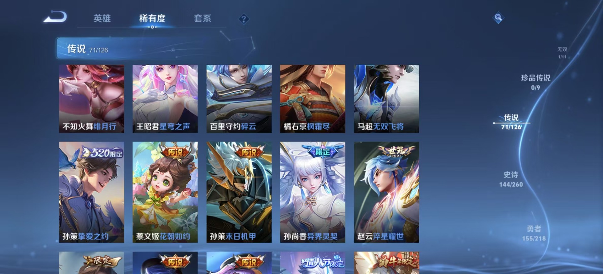 黄忠烈魂,甄姬幽恒,盾山梦圆繁星,铠青龙志,伽罗太华,张飞虎魄,赵云龙胆,孙膑天狼运算者,干将莫邪冰霜恋舞曲,典韦岱宗,孙尚香异界灵契,不知火舞绯月行,牛魔奔雷神使,项羽霸王别姬,吕布御风骁将,后羿如梦令,露娜一生所爱,庄周玄嵩,庄周云端筑梦师,诸葛亮时雨天司,兰陵王默契交锋,公孙离祈雪灵祝,裴擒虎李小龙,裴擒虎天狼狩猎者,上官婉儿神器·万象笔,上官婉儿天狼绘梦者,李白诗剑行,花木兰默契交锋,马可波罗逐梦之星,马可波罗山海·玄木吟,桑启鸣野蒿,女娲愿照·千秋盛,孙悟空孙行者,孙悟空大圣娶亲,芈月白晶晶,孙悟空至尊宝,百里玄策白虎志,马超神威,雅典娜神奇女侠,妲己时之彼端,妲己时之奇旅,韩信飞衡,百里守约朱雀志,墨子降魔,瑶山海·碧波行,澜愿照·九州拓,虞姬霸王别姬,嫦娥如梦令,王昭君凤凰于飞,王昭君星穹之声,关羽武圣,关羽冰锋战神,橘右京枫霜尽