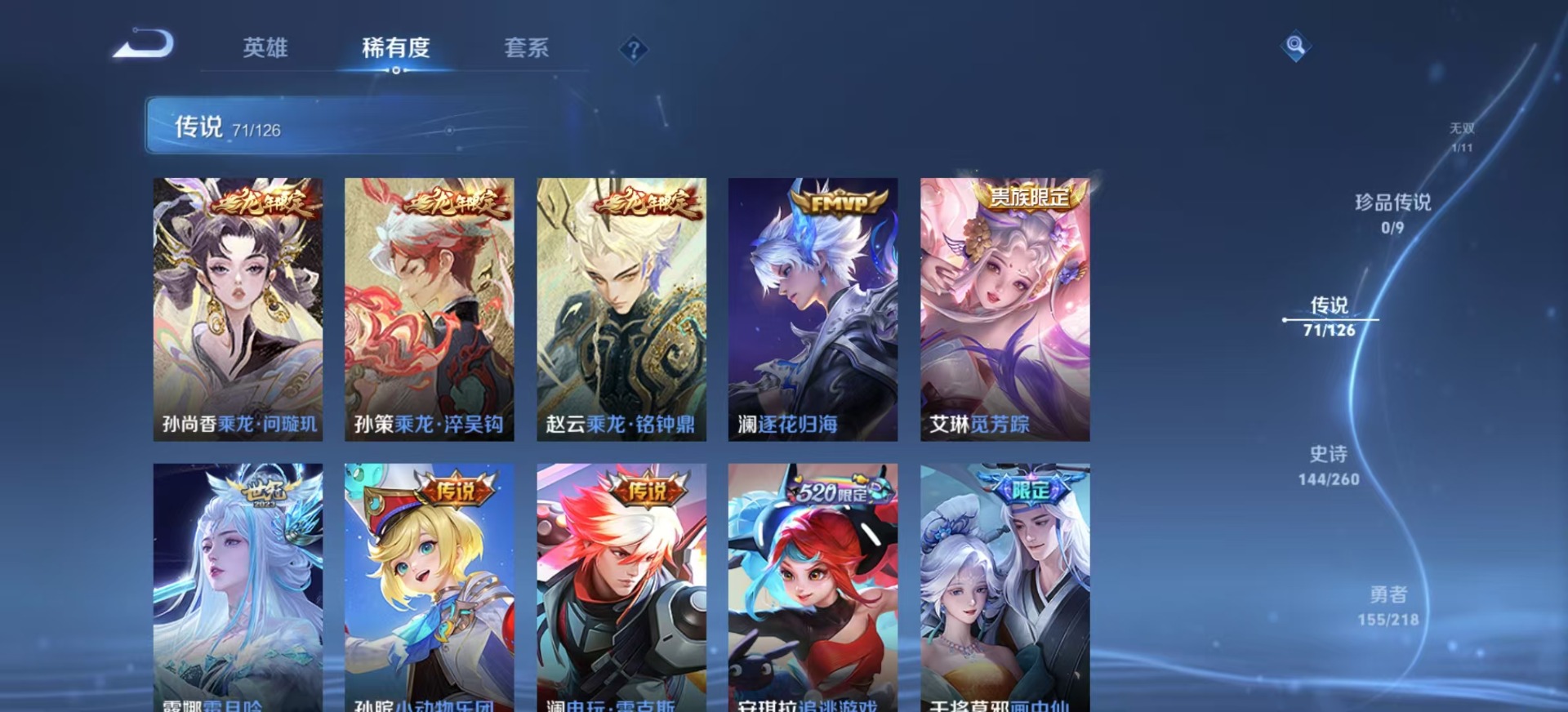 - [12030496]V9 3典藏 2珍品传说 20传说 125英雄 264皮肤 可修改实名 优质装备:杀手不太冷,全息碎影(猴子典藏),神鉴启示录,江户川柯南,酷洛米之心,黄金射手座,绛天战甲(鸡嘴战神),猫影幻舞,久胜战神,云霓雀翎,末日机甲-孙尚香(绿蚂蚱),地狱火,仲夏夜之梦(大飞蛾),花朝如约(花篮子),玄雷天君,涂山容容 传说皮:乘龙·问璇玑(孙尚香年限),幻光神枪 珍宝阁皮:优雅恋人,蔷薇恋人 限定皮:愿照·岁时盈(虞姬年限),愿照·山河定(司空震年限),愿照·众生和(妲己年限),逐霄战戟,鸣野蒿,异界灵契(白毛香),时之彼端,瑞麟志(木兰年限),高山流水,无限倾心-虞姬,齐天大圣,匿光决锋者,五谷丰年,梁祝,如梦令-后羿,孙行者,大圣娶亲,山海·玄木吟(马可年限) 史诗皮:鸭鸭历险记-刘禅,狼魂孤将,绮世丹青,谪仙醉月,布丁狗之誓,茶境仙,破空之剑,战舞者,乘龙·聚宝船(安琪拉年限),百相守梦-百里守约,百相守梦-黄忠,紫霞仙子,苍穹之光,电玩小子(小书包),黄金分割率,特工魅影,千年之狐,匿光侦查者,无限星赏官,冰冠公主,偶像歌手,暗夜猫娘,龙骑士(小龙虾),末日机甲-吕布,时之恋人-孙尚香,乱世虎臣,节奏热浪,修罗,女仆咖啡,水果甜心,天才门将,星夜王子,心灵骇客,时之奇旅-安琪拉,德古拉伯爵,暗隐猎兽者,幽灵船长,鬼剑武藏,心灵战警,天秀·启明,舞动绿茵,缤纷独角兽,逐浪之夏,水晶猎龙者,箭羽风息,唤灵魅影,金属风暴,圣诞狂欢,圣诞恋歌,鹰眼统帅,魅力维加斯,无心,未来纪元-赵云