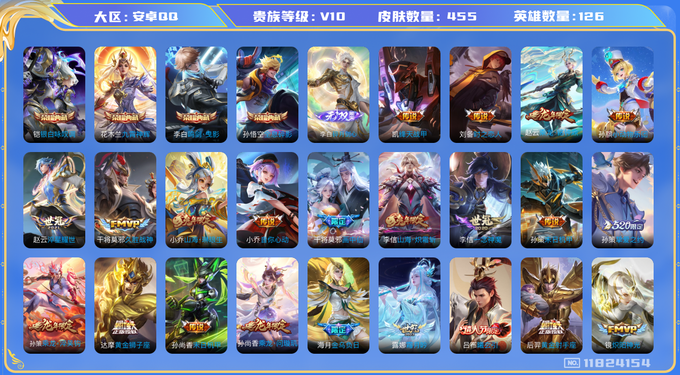 [11824154]V10 4典藏 1无双 71传说 126英雄 455皮肤 典藏英雄武则天 可修改实名 优质装备:鸣剑·曳影,全息碎影(猴子典藏),九霄神辉(木兰典藏),银白咏叹调(倪克斯侍卫),碎月剑心(李白无双),黄金狮子座,黄金射手座,冠军飞将,云鹰飞将(小将军),绛天战甲(鸡嘴战神),黄金白羊座,久胜战神,炽阳神光,一念神魔,云霓雀翎,末日机甲-孙尚香(绿蚂蚱),地狱火,仲夏夜之梦(大飞蛾),音你心动-小乔,零号·赤焰,海洋之心,地狱之眼,音你心动-周瑜,胖达荣荣,李逍遥,时之恋人-刘备(电焊工),淬星耀世,超时空战士-狄仁杰,末日机甲-孙策,花朝如约(花篮子),挚爱之约,无双飞将,碎云,神器·狴犴令,山海·炽霜斩(李信年限),山海·琳琅生(小乔年限),山海·苍雷引(电光曜子),燃星之曲,画中仙,追逃游戏(安琪拉),电玩·雷克斯,小动物乐团,霜月吟,澜逐花归海,艾琳觅芳踪,金乌负日,黄金天蝎座,玄雷天君 传说皮:乘龙·问璇玑(孙尚香年限),乘龙·铭钟鼎(赵云年限),乘龙·淬吴钩(孙策年限),貂蝉曦玄引,吕布曦玄引,落雪白狼,幻光神枪 珍宝阁皮:女武神,玩趣恶龙 限定皮:愿照·九州拓(澜年限),愿照·千秋盛(女娲年限),鸣野蒿,至尊宝,白虎志(电光耗子),凤凰于飞,太华(伽罗年限),异界灵契(白毛香),星穹之声,绯月行,时之彼端,白晶晶,时雨天司(水龙头),神威(电光马子),飞衡(韩信年限),玄嵩(庄周年限),山海·碧波行(瑶年限),无限倾心-项羽,诗剑行,无限倾心-虞姬,齐天大圣,怒海麟威,降魔,五谷丰年,青龙志(铠年限),冰锋战神,幽恒(沐浴露),武圣,天狼运算者,游园惊梦,御风骁将(吕布年限),天狼狩猎者,龙胆,逐梦之星,烈魂,岱宗(典韦年限),虎魄,奔雷神使(牛魔年限),祈雪灵祝(雪兔子),天狼绘梦者,李小龙,朱雀志(守约年限),永曜之星,如梦令-嫦娥,如梦令-后羿,霸王别姬-项羽,霸王别姬-虞姬,默契交锋-兰陵王,默契交锋-花木兰,孙行者,一生所爱,大圣娶亲,天魔缭乱,冰霜恋舞曲,云端筑梦师,神奇女侠,枫霜尽,时之奇旅-妲己,神器·万象笔,梦圆繁星,山海·玄木吟(马可年限) 史诗皮:星界战将,灵蛊蚀心,龙之律动,石田雨龙,茶境仙,海诺心动手记,东方月初,芈月浮光幕影,上官婉儿群星魔术团,奇遇星旅,曹操夜都魔契,超元猎域,乘龙·聚宝船(安琪拉年限),乘龙·忆丹青(大