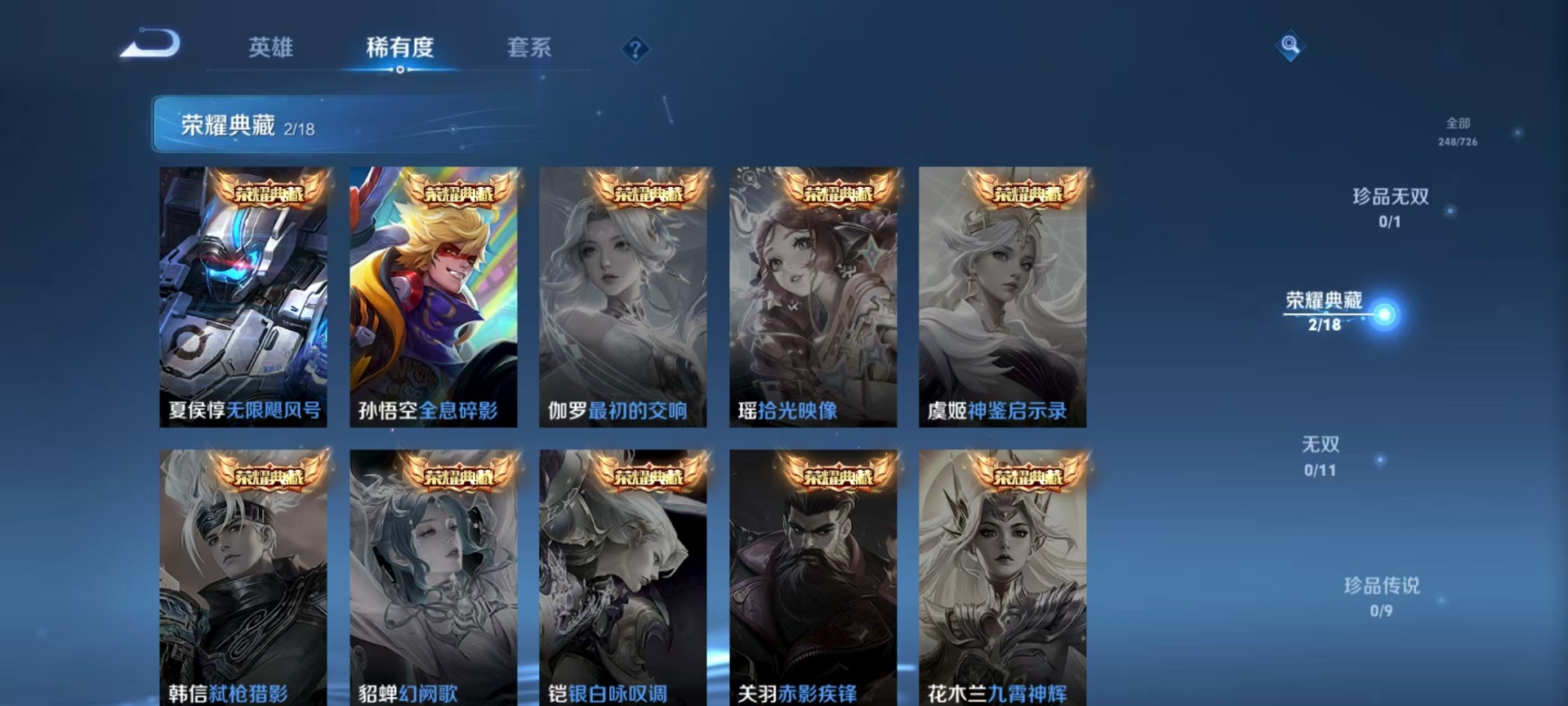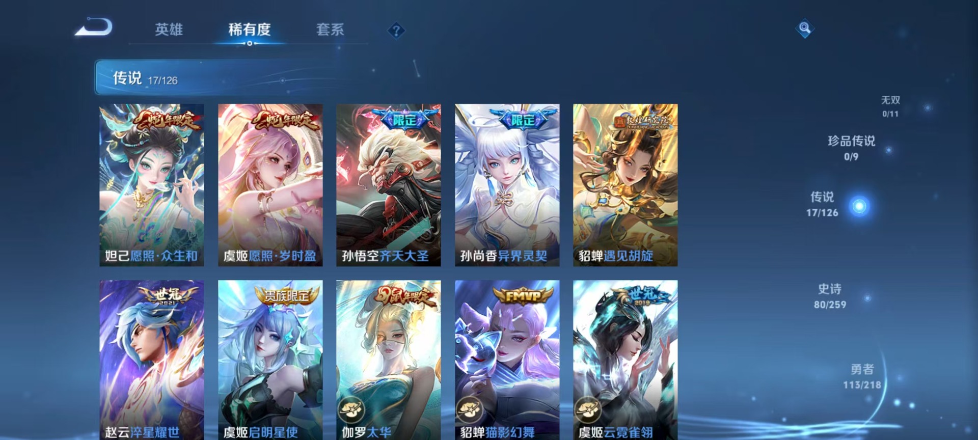 大乔白鹤梁神女,铠青龙志,伽罗天狼溯光者,伽罗太华,赵云百木心枪,赵云龙胆,典韦岱宗,孙尚香异界灵契,项羽霸王别姬,吕布御风骁将,露娜一生所爱,裴擒虎李小龙,东皇太一逐梦之光,上官婉儿梁祝,猪八戒猪悟能,孙悟空孙行者,孙悟空大圣娶亲,孙悟空至尊宝,芈月白晶晶,百里玄策白虎志,妲己愿照·众生和,虞姬霸王别姬,虞姬愿照·岁时盈,妲己热情桑巴,关羽冰锋战神