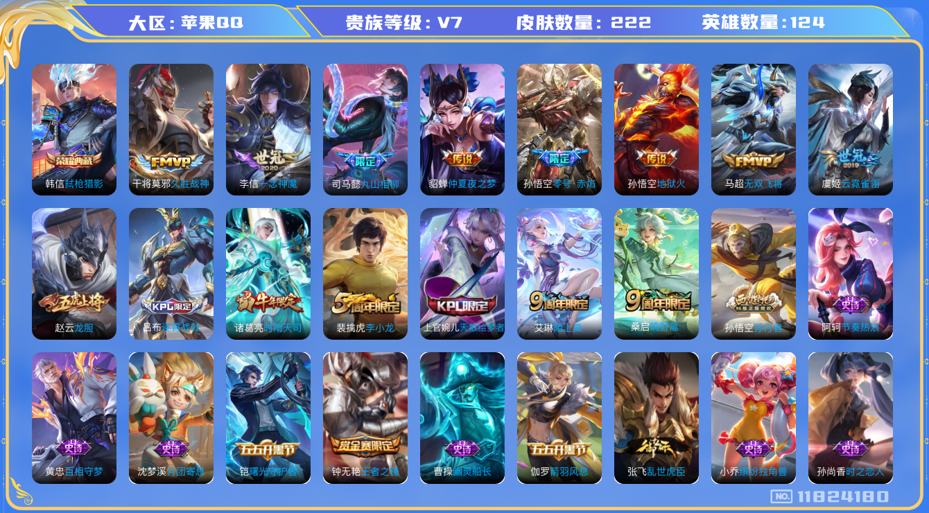 [11824180]V7 1典藏 10传说 124英雄 222皮肤 可修改实名 优质装备:弑枪猎影(韩信典藏),久胜战神,一念神魔,云霓雀翎,地狱火,仲夏夜之梦(大飞蛾),零号·赤焰,无双飞将 传说皮:九山相柳 珍宝阁皮:玩趣恶龙 限定皮:逐霄战戟,陌上桑,鸣野蒿,时雨天司(水龙头),龙胆,天狼绘梦者,李小龙,孙行者 史诗皮:鸭鸭历险记-刘禅,龙之律动,石田雨龙,百相守梦-周瑜,破空之剑,战舞者,谪仙醉月,蔬乡物语(鲁班七号),百相守梦-百里守约,炽弈燎原,百相守梦-黄忠,紫霞仙子,黄金分割率,千年之狐,真我赫兹(百里守约),偶像歌手,无限星赏官,晚萤,末日机甲-吕布,猫狗日记-孙策,时之恋人-孙尚香,乱世虎臣,节奏热浪,修罗,女仆咖啡,水果甜心,绅士熊喵,心灵骇客,功夫厨神,暗隐猎兽者,幽灵船长,鬼剑武藏,乐园奇幻夜,天秀·启明,舞动绿茵,纤云弄巧,繁星吟游(呼啦呼啦),缤纷独角兽,逐浪之夏,月团寄思,水晶猎龙者,曙光守护者,热力回旋,箭羽风息,金属风暴,圣诞狂欢,鹰眼统帅,王者之锤,无心