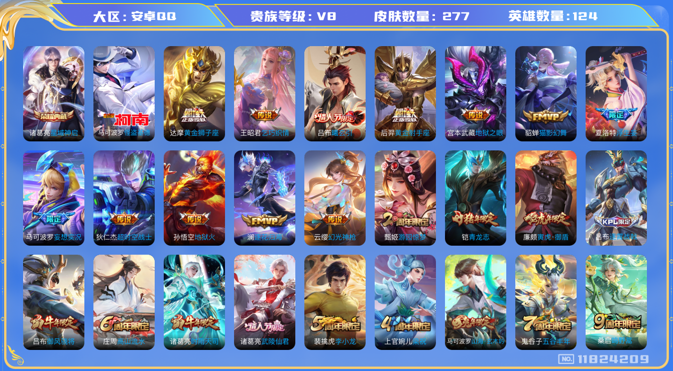 [11824209]V8 1典藏 1珍品传说 18传说 124英雄 277皮肤 可修改实名 荣耀水晶:星域神启(倪克斯贼亮) 珍品传说:怪盗基德 传说皮:吕布曦玄引,幻光神枪,黄金狮子座,黄金射手座,地狱火,地狱之眼,猫影幻舞,乞巧织情,超时空战士-狄仁杰,浮生妄,妄想实况,澜逐花归海 珍宝阁皮:蔷薇恋人,女武神 限定皮:愿照·九州拓(澜年限),愿照·岁时盈(虞姬年限),逐霄战戟,鸣野蒿,武陵仙君(小桃花),时雨天司(水龙头),神威(电光马子),高山流水,五谷丰年,青龙志(铠年限),冰锋战神,游园惊梦,梁祝,御风骁将(吕布年限),李小龙,大圣娶亲,引擎之心,寅虎·御盾(廉颇年限),山海·玄木吟(马可年限) 史诗皮:飞车小橘子,撼地雄心,鸭鸭历险记-刘禅,龙之律动,雪豹·霜爪,百相守梦-百里守约,百相守梦-黄忠,战舞者,决胜骁骑,百相守梦-周瑜,化蝶舞,破空之剑,紫霞仙子,电玩小子(小书包),白龙吟,黄金分割率,特工魅影,江河有灵,百解令(蒙犽),冰冠公主,青蛇,偶像歌手,魅语,龙骑士(小龙虾),末日机甲-吕布,猫狗日记-孙策,猫狗日记-大乔,乱世虎臣,节奏热浪,修罗,女仆咖啡,摇滚巨星,水果甜心,绅士熊喵,天才门将,星夜王子,心灵骇客,功夫厨神,德古拉伯爵,幽灵船长,鬼剑武藏,心灵战警,乐园奇幻夜,天秀·启明,舞动绿茵,地狱岩魂,纤云弄巧,拒霜思,乘风破浪,逐浪之夏,月团寄思,水晶猎龙者,金属风暴,圣诞狂欢,圣诞恋歌,鹰眼统帅,暗夜贵公子,魅力维加斯,赏金猎手,寅虎·御盾,未来纪元-赵云