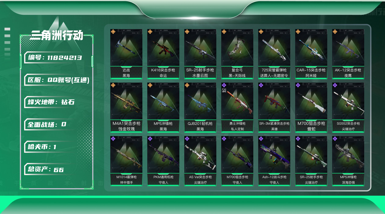 [11824213]总资产:66.6M 1近战传说 10传说枪械 哈夫币:1.310K 可二次 可修改实名 优质装备:近战-黑海,K416突击步枪-命运(典藏) 烽火地带段位:钻石 全面战场段位:上等兵 传说武器皮肤:SR-25射手步枪-水墨云图,复合弓-黑-天际线,725双管霰弹枪-送葬人-无题密令,CAR-15突击步枪-阿米娅,AK-12突击步枪-夜鹰,M4A1突击步枪-蚀金玫瑰,MP5冲锋枪-黑海,QJB201轻机枪-黑海 史诗武器皮肤:勇士冲锋枪-私人定制(典藏),SR-3M紧凑突击步枪-英雄,M700狙击步枪-蝮蛇,SG552突击步枪-尖端治疗,M1014霰弹枪-林中猎手,PKM通用机枪-守夜人,AS Val突击步枪-尖端治疗,M700狙击步枪-守夜人,Ash-12战斗步枪-守夜人,SR-25射手步枪-尖端治疗,MP5冲锋枪-深海恐惧,勇士冲锋枪-深海恐惧,AKM突击步枪-林中猎手,M16A4突击步枪-竞赛选手,M250通用机枪-囚徒,SV-98狙击步枪-林中猎手,PTR-32突击步枪-英雄,SV-98狙击步枪-囚徒,SVD狙击步枪-暗夜猎手,PSG-1射手步枪-无垢,SVD狙击步枪-荒野求生,SR-3M紧凑突击步枪-荒野求生,PKM通用机枪-荒野求生