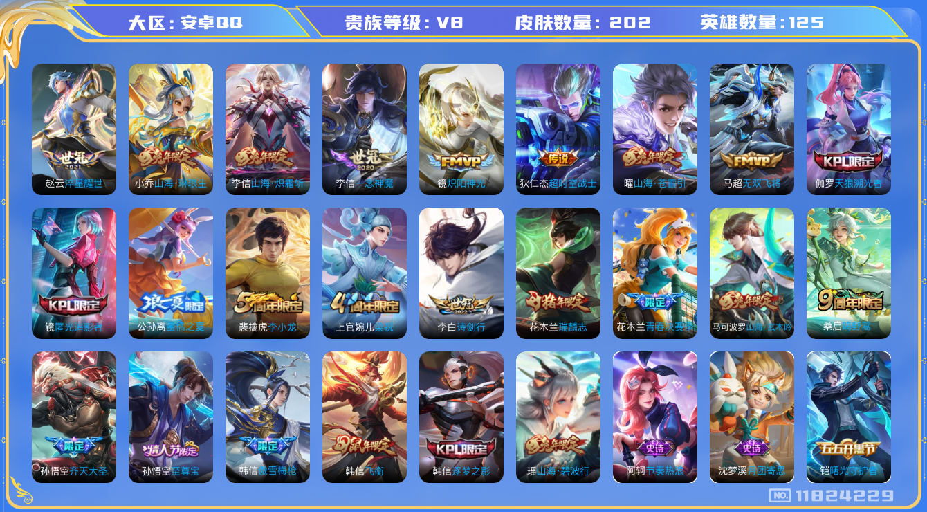 [11824229]V8 12传说 125英雄 202皮肤 可修改实名 优质装备:炽阳神光,一念神魔,淬星耀世,超时空战士-狄仁杰,无双飞将,山海·炽霜斩(李信年限),山海·琳琅生(小乔年限),山海·苍雷引(电光曜子) 珍宝阁皮:蔷薇恋人 限定皮:鸣野蒿,至尊宝,傲雪梅枪,飞衡(韩信年限),山海·碧波行(瑶年限),瑞麟志(木兰年限),诗剑行,齐天大圣,梁祝,天狼溯光者,李小龙,逐梦之影,青春决赛季,蜜橘之夏,匿光追影者,山海·玄木吟(马可年限) 史诗皮:紫霞仙子,白龙吟,黄金分割率,特工魅影,千年之狐,百相守梦(刘备),江河有灵,偶像歌手,龙骑士(小龙虾),魅语,无限星赏官,晚萤,末日机甲-吕布,猫狗日记-孙策,节奏热浪,修罗,女仆咖啡,摇滚巨星,水果甜心,绅士熊喵,星夜王子,功夫厨神,幽灵船长,鬼剑武藏,纤云弄巧,拒霜思,缤纷独角兽,逐浪之夏,月团寄思,水晶猎龙者,曙光守护者,金属风暴,圣诞狂欢,圣诞恋歌,鹰眼统帅,魅力维加斯,赏金猎手,未来纪元-赵云