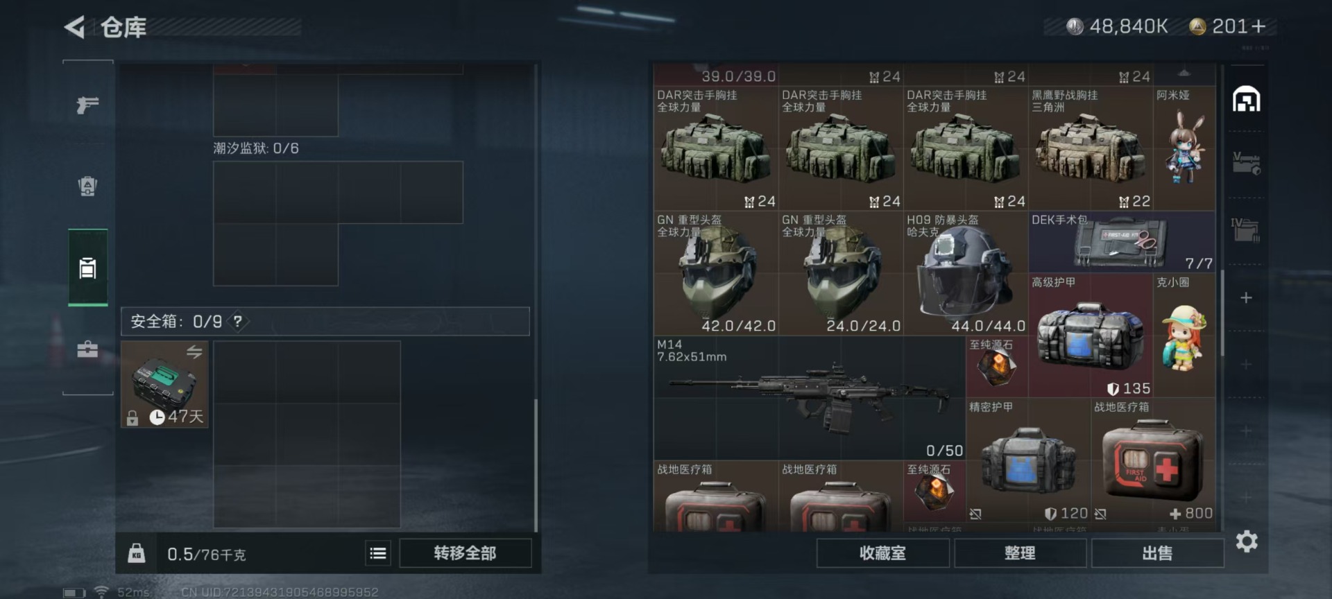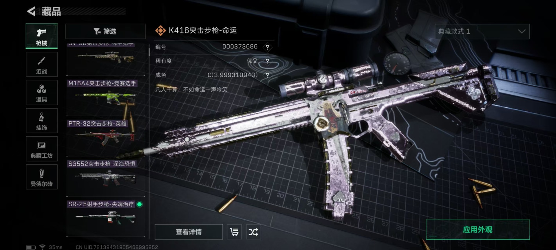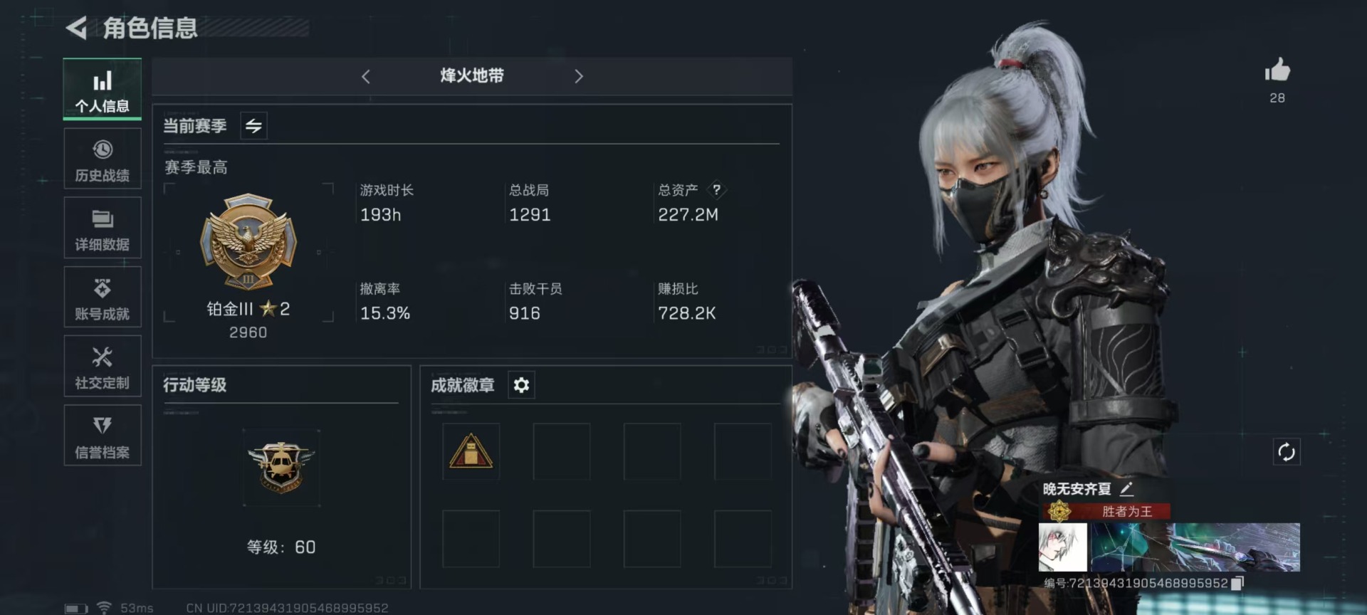 - [12026058]总资产:128.5M 3干员外观 1近战传说 12传说枪械 哈夫币:1.527K 顶级安全箱(3×3)9.15号到期 可二次 可修改实名 优质装备:近战-影锋,顶级安全箱(3x3) 烽火地带段位:钻石 全面战场段位:尉官 传说武器皮肤:AS Val突击步枪-蛇年祥瑞,SCAR-H战斗步枪-水墨云图,M1014霰弹枪-影锋,AWM狙击步枪-影锋,SCAR-H战斗步枪-铁艺苍穹,AK-12突击步枪-夜鹰,SMG45冲锋枪-骑士,CAR-15突击步枪-阿米娅,复合弓-黑-天际线,725双管霰弹枪-送葬人-无题密令,M4A1突击步枪-蚀金玫瑰 史诗武器皮肤:QBZ95-1突击步枪-ACE,M4A1突击步枪-特勤执行,AUG突击步枪-特勤执行,Vector冲锋枪-红色彗星,PTR-32战斗步枪-ACE,SKS射手步枪-ACE,M700狙击步枪-蝮蛇,PKM通用机枪-蝮蛇,SR-25射手步枪-战场英杰,SR-25射手步枪-尖端治疗,AS Val突击步枪-尖端治疗,SG552突击步枪-尖端治疗,Ash-12战斗步枪-守夜人,SR-3M紧凑突击步枪-荒野求生,SG552突击步枪-深海恐惧,AKM突击步枪-林中猎手,M16A4突击步枪-竞赛选手,PKM通用机枪-守夜人,SVD狙击步枪-荒野求生,P90冲锋枪-暗影猎手,M1014霰弹枪-林中猎手,SV-98狙击步枪-林中猎手,PTR-32突击步枪-英雄,SV-98狙击步枪-囚徒,SCAR-H战斗步枪-囚徒,腾龙突击步枪-无垢,MP7冲锋枪-无垢,Vector冲锋枪-阿萨拉文明,SVD狙击步枪-阿萨拉工艺,S12K霰弹枪-曙光,PKM通用机枪-英雄 干员外观:红狼-蚀金玫瑰,骇爪-水墨云图,露娜-黑·天际线