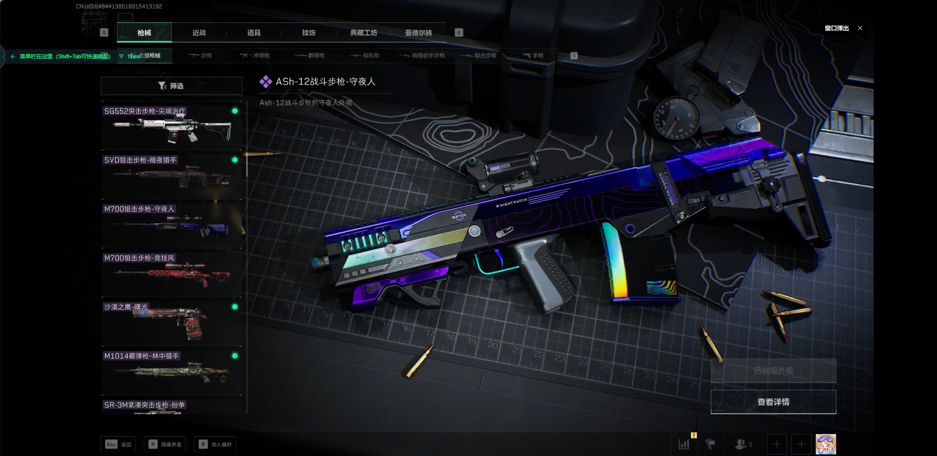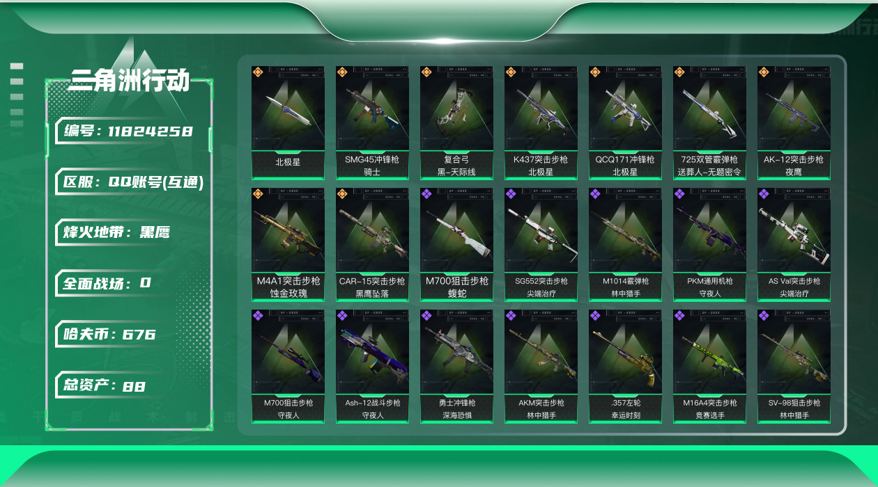 [11824258]总资产:88.1M 2干员外观 1近战传说 9传说枪械 哈夫币:676.478K 可二次 可修改实名 优质装备:近战-北极星 烽火地带段位:黑鹰 全面战场段位:无段位 传说武器皮肤:SMG45冲锋枪-骑士,复合弓-黑-天际线,K437突击步枪-北极星,QCQ171冲锋枪-北极星,725双管霰弹枪-送葬人-无题密令,AK-12突击步枪-夜鹰,M4A1突击步枪-蚀金玫瑰,CAR-15突击步枪-黑鹰坠落 史诗武器皮肤:M700狙击步枪-蝮蛇,SG552突击步枪-尖端治疗,M1014霰弹枪-林中猎手,PKM通用机枪-守夜人,AS Val突击步枪-尖端治疗,M700狙击步枪-守夜人,Ash-12战斗步枪-守夜人,勇士冲锋枪-深海恐惧,AKM突击步枪-林中猎手,.357左轮-幸运时刻,M16A4突击步枪-竞赛选手,SV-98狙击步枪-林中猎手,SV-98狙击步枪-囚徒,SVD狙击步枪-暗夜猎手,PSG-1射手步枪-无垢,SVD狙击步枪-荒野求生,SR-3M紧凑突击步枪-荒野求生,PKM通用机枪-荒野求生,沙漠之鹰-曙光,SVD狙击步枪-阿萨拉工艺,M700狙击步枪-竞技风 干员外观:红狼-蚀金玫瑰,露娜-黑·天际线