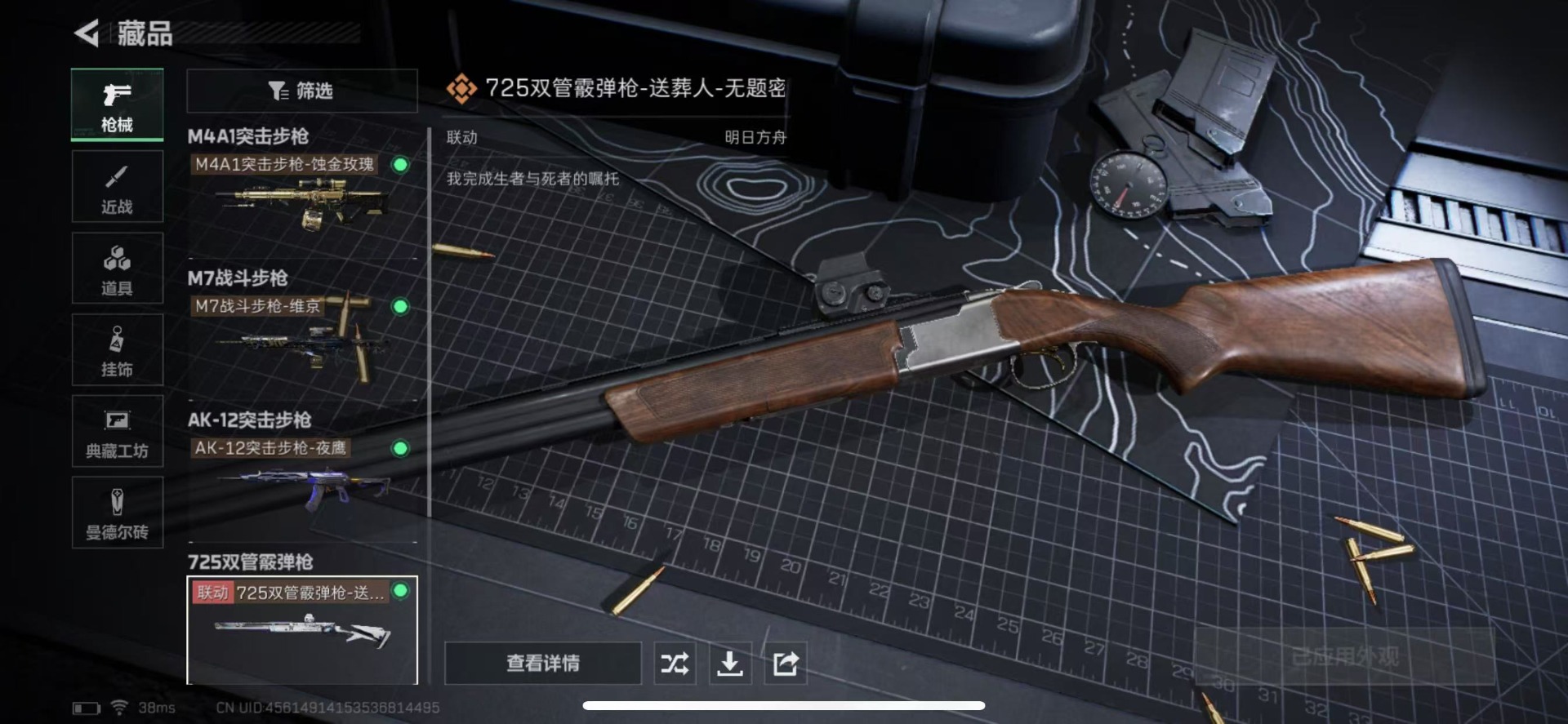- [12084796]总资产:294.4M 1干员外观 14传说枪械 哈夫币:79.136K 高级安全箱(2×3)9.15号到期 可二次 可修改实名 烽火地带段位:钻石 全面战场段位:校官 传说武器皮肤:SR-25射手步枪-水墨云图,AK-12突击步枪-夜鹰,G18-飞虎,SMG45冲锋枪-骑士,M4A1突击步枪-阿米娅,复合弓-黑-天际线,AK-12突击步枪-特斯拉线圈,SR-3M紧凑突击步枪-特斯拉线圈,UZI冲锋枪-特斯拉线圈,勇士冲锋枪-能天使-午夜邮差,725双管霰弹枪-送葬人-无题密令,P90冲锋枪-神秘艺术,M7战斗步枪-神秘艺术,CAR-15突击步枪-黑鹰坠落 史诗武器皮肤:SR-3M紧凑突击步枪-英雄,AUG突击步枪-蝮蛇,M700狙击步枪-蝮蛇,PKM通用机枪-蝮蛇,G3战斗步枪-战场英杰,SR-25射手步枪-尖端治疗,PKM通用机枪-荒野求生,AS Val突击步枪-尖端治疗,M700狙击步枪-守夜人,SG552突击步枪-尖端治疗,Ash-12战斗步枪-守夜人,MP5冲锋枪-深海恐惧,SR-3M紧凑突击步枪-荒野求生,勇士冲锋枪-深海恐惧,SG552突击步枪-深海恐惧,AKM突击步枪-林中猎手,.357左轮-幸运时刻,M16A4突击步枪-竞赛选手,PKM通用机枪-守夜人,SVD狙击步枪-荒野求生,M1014霰弹枪-林中猎手,SV-98狙击步枪-林中猎手,PSG-1射手步枪-无垢,AS Val突击步枪-典狱官,M250通用机枪-囚徒,SV-98狙击步枪-囚徒,SCAR-H战斗步枪-囚徒,腾龙突击步枪-无垢,MP7冲锋枪-无垢,QBZ95-1突击步枪-曙光,沙漠之鹰-曙光,SCAR-H-猎鳄行动,K416突击步枪-竞技风,Vector冲锋枪-阿萨拉文明,SVD狙击步枪-阿萨拉工艺,S12K霰弹枪-曙光,AS Val突击步枪-刀锋,PKM通用机枪-英雄,M14射手步枪-黑鹰坠落,M700狙击步枪-竞技风,QSZ92G-风林火山,93R-博士 干员外观:蜂医-送葬人·无题密令(S5)