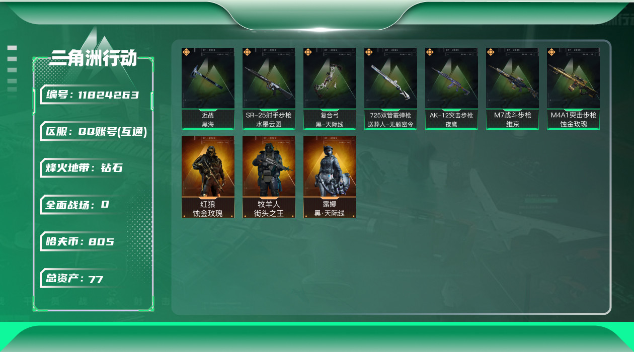 [11824263]总资产:77.3M 3干员外观 1近战传说 7传说枪械 哈夫币:805.272K 可二次 可修改实名 优质装备:近战-黑海 烽火地带段位:钻石 全面战场段位:无段位 传说武器皮肤:SR-25射手步枪-水墨云图,复合弓-黑-天际线,725双管霰弹枪-送葬人-无题密令,AK-12突击步枪-夜鹰,M7战斗步枪-维京,M4A1突击步枪-蚀金玫瑰 干员外观:红狼-蚀金玫瑰,牧羊人-街头之王,露娜-黑·天际线