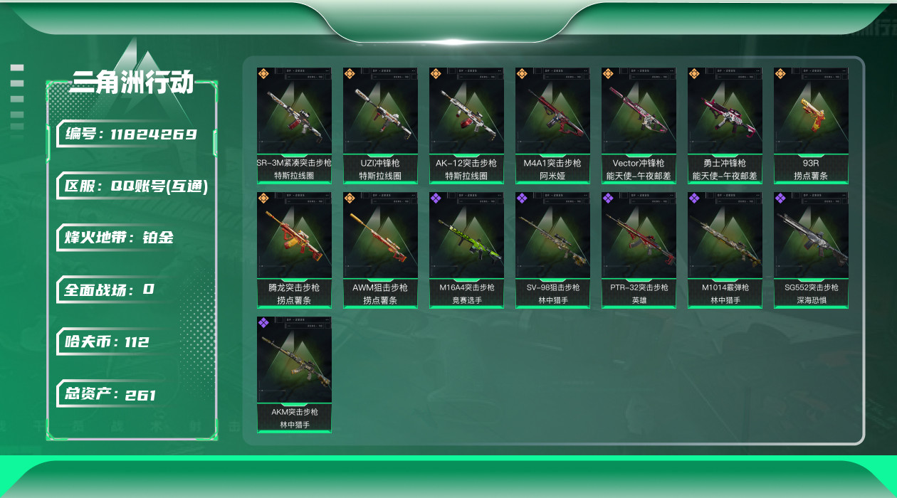 [11824269]总资产:261.2M 9传说枪械 哈夫币:112K 进阶安全箱(9.17到期) 可二次 可修改实名 烽火地带段位:铂金 全面战场段位:无段位 传说武器皮肤:93R-捞点薯条,AWM狙击步枪-捞点薯条,腾龙突击步枪-捞点薯条,AK-12突击步枪-特斯拉线圈,SR-3M紧凑突击步枪-特斯拉线圈,UZI冲锋枪-特斯拉线圈,勇士冲锋枪-能天使-午夜邮差,Vector冲锋枪-能天使-午夜邮差,M4A1突击步枪-阿米娅 史诗武器皮肤:M16A4突击步枪-竞赛选手,M1014霰弹枪-林中猎手,SG552突击步枪-深海恐惧,AKM突击步枪-林中猎手,SV-98狙击步枪-林中猎手,PTR-32突击步枪-英雄