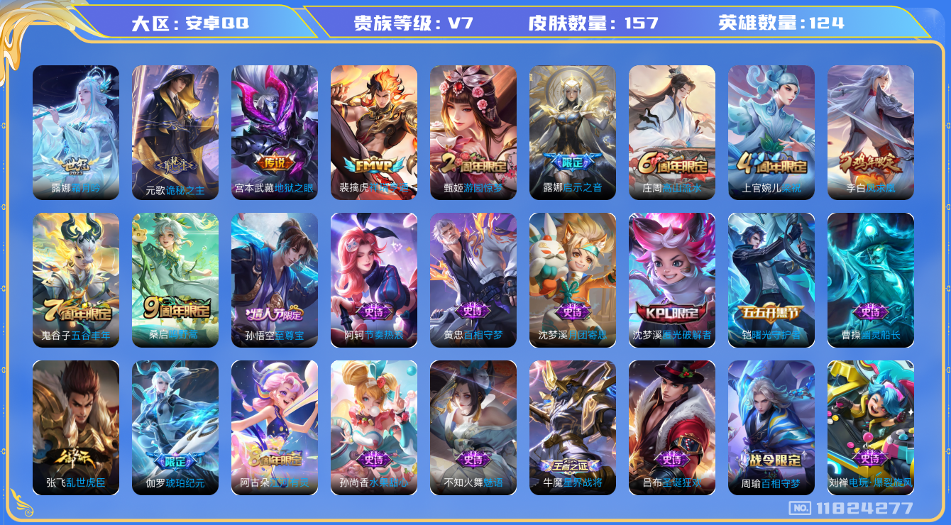 [11824277]V7 7传说 124英雄 157皮肤 可修改实名 优质装备:地狱之眼,霜月吟,诡秘之主,涂山容容 传说皮:祥瑞亨通 珍宝阁皮:蔷薇恋人 限定皮:鸣野蒿,至尊宝,凤求凰(白切鸡),高山流水,五谷丰年,游园惊梦,梁祝,启示之音 史诗皮:赞萌露比,星界战将,龙之律动,百相守梦-周瑜,东方月初,琥珀纪元伽罗,百相守梦-黄忠,千年之狐,江河有灵,魅语,蒙恬荣光圣徽,匿光破解者,冰冠公主,电玩·爆裂旋风,龙骑士(小龙虾),乱世虎臣,节奏热浪,女仆咖啡,水果甜心,绅士熊喵,天才门将,心灵骇客,幽灵船长,鬼剑武藏,舞动绿茵,月团寄思,水晶猎龙者,曙光守护者,金属风暴,原初追逐者,圣诞狂欢,圣诞恋歌,鹰眼统帅,魅力维加斯