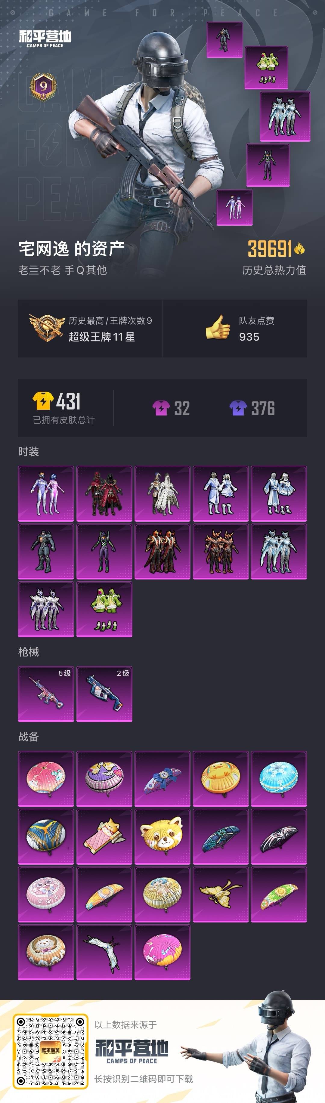 - [12295316]22橙皮 1金皮 11紫皮 93皮肤 27英雄 95卡面 910已用源晶 未定级 优质装备:掠影套装,狂徒-塑水宗,狂徒-掠影,狂徒-紫阙金琅,正义-掠影,冥驹-掠影,骇灵-781-A协议,戍卫-掠影,鬼魅-天界神兵,匕首-超限闪存,影刃,荒土机兵热能刀,鬼丸国纲,神圣领域 战刀,未来开拓者,源始幻刃,诡秘蛇影,雄鹿-盖亚的复仇2.0 套装:般若假面//2.0套装,虚空遗器,西部未来 佩枪皮肤:狂怒-般若假面//2.0,标配-VCT25xBLG,正义-西部未来,正义-虚空遗器,短炮-归零者 冲锋枪皮肤:蜂刺-噬影者 霰弹枪皮肤:判官-虚空遗器 步枪皮肤:獠犬-般若假面//2.0,狂徒-般若假面//2.0,狂徒-虚空遗器,幻影-虚空遗器,幻影-西部未来 狙击枪皮肤:莽侠-创·纪元,飞将-西部未来 机枪皮肤:奥丁-西部未来,战神-般若假面//2.0
