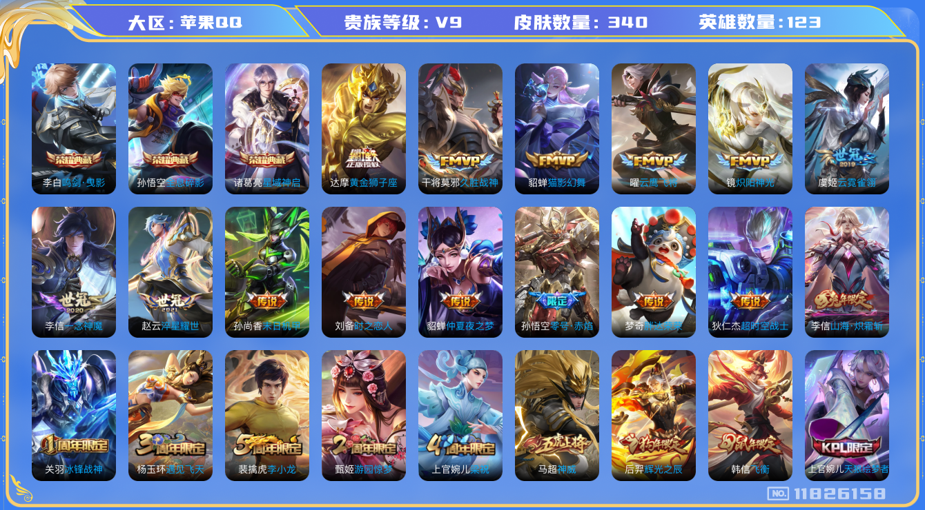 [11826158]【商品标题】:苹果Q-V9-至尊星耀II段位-123英雄-340皮肤-3典藏-0珍品无双-0无双-0珍品传说-20传说-107史诗