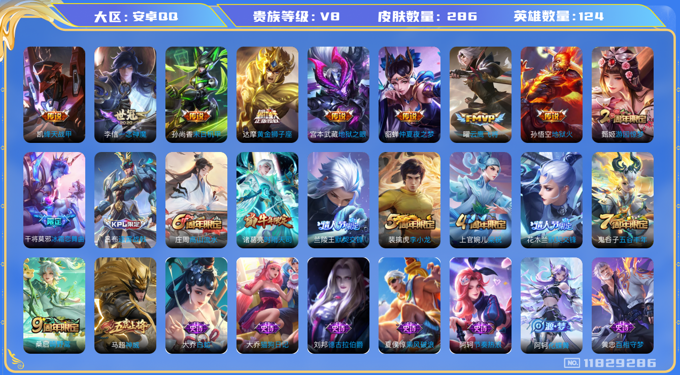 [11829286]V8 12传说 124英雄 286皮肤 可修改实名 女号 优质装备:黄金狮子座,云鹰飞将(小将军),绛天战甲(鸡嘴战神),一念神魔,末日机甲-孙尚香(绿蚂蚱),地狱火,仲夏夜之梦(大飞蛾),地狱之眼,涂山容容 珍宝阁皮:万物之道,蔷薇恋人,玩趣恶龙 限定皮:逐霄战戟,鸣野蒿,时雨天司(水龙头),神威(电光马子),高山流水,五谷丰年,游园惊梦,梁祝,李小龙,默契交锋-兰陵王,默契交锋-花木兰,冰霜恋舞曲 史诗皮:化蝶舞,星界战将,龙之律动,百相守梦-黄忠,织梦人,紫霞仙子,电玩小子(小书包),黄金分割率,特工魅影,千年之狐,江河有灵,蒙恬荣光圣徽,偶像歌手,白蛇,电玩·爆裂旋风,龙骑士(小龙虾),末日机甲-吕布,猫狗日记-孙策,猫狗日记-大乔,时之恋人-孙尚香,乱世虎臣,节奏热浪,修罗,女仆咖啡,摇滚巨星,水果甜心,绅士熊喵,天才门将,星夜王子,心灵骇客,功夫厨神,德古拉伯爵,暗隐猎兽者,幽灵船长,鬼剑武藏,心灵战警,纤云弄巧,拒霜思,乘风破浪,逐浪之夏,水晶猎龙者,曙光守护者,热力回旋,金属风暴,圣诞狂欢,圣诞恋歌,鹰眼统帅,魅力维加斯,无心,未来纪元-赵云