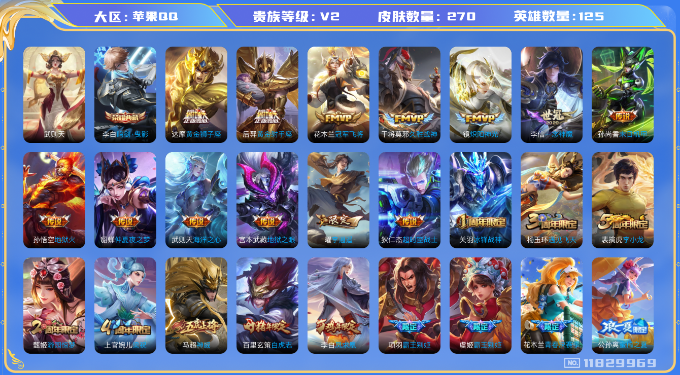 [11829969]【商品标题】:苹果Q-V2-荣耀黄金I段位-125英雄-270皮肤-1典藏-0珍品无双-0无双-0珍品传说-19传说-77史诗