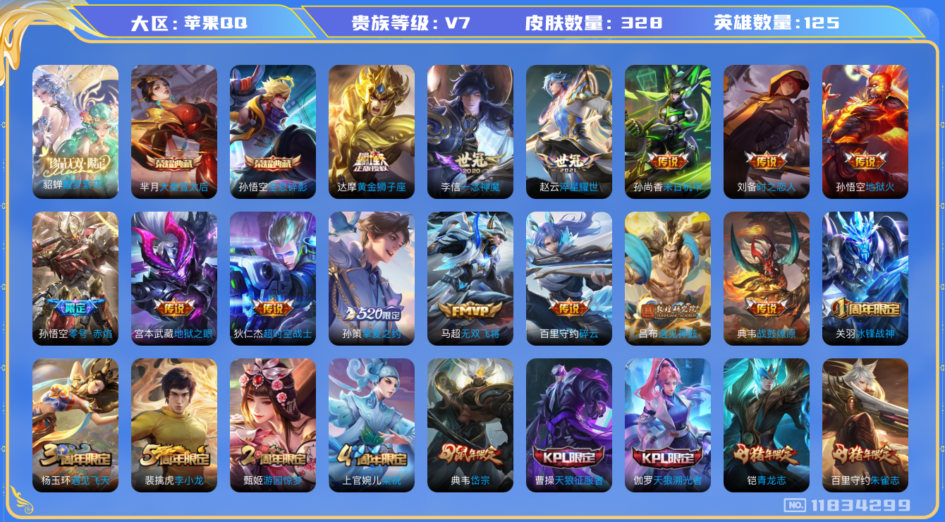 [11834299]【商品标题】:苹果Q-V7-永恒钻石II段位-125英雄-328皮肤-2典藏-1珍品无双-0无双-0珍品传说-18传说-97史诗