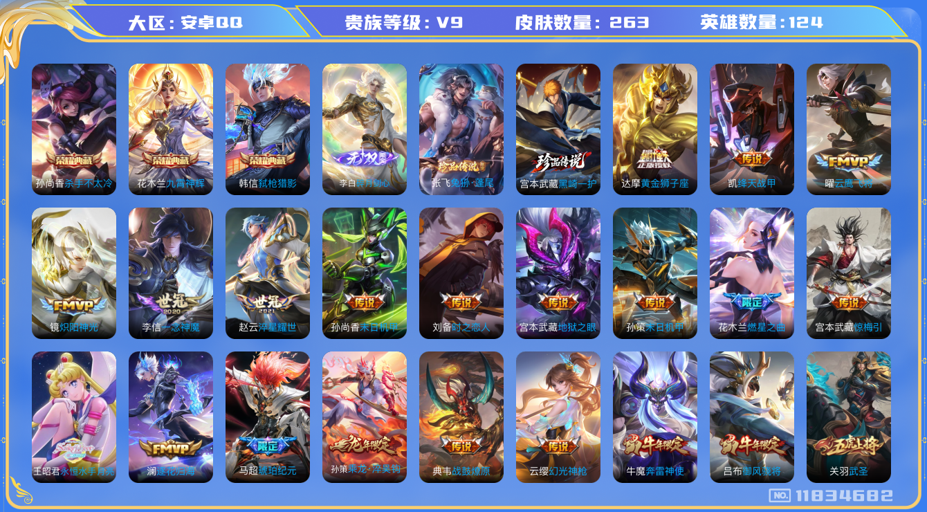 [11834682]【商品标题】:安卓Q-V9-最强王者段位-124英雄-263皮肤-3典藏-0珍品无双-1无双-2珍品传说-26传说-82史诗