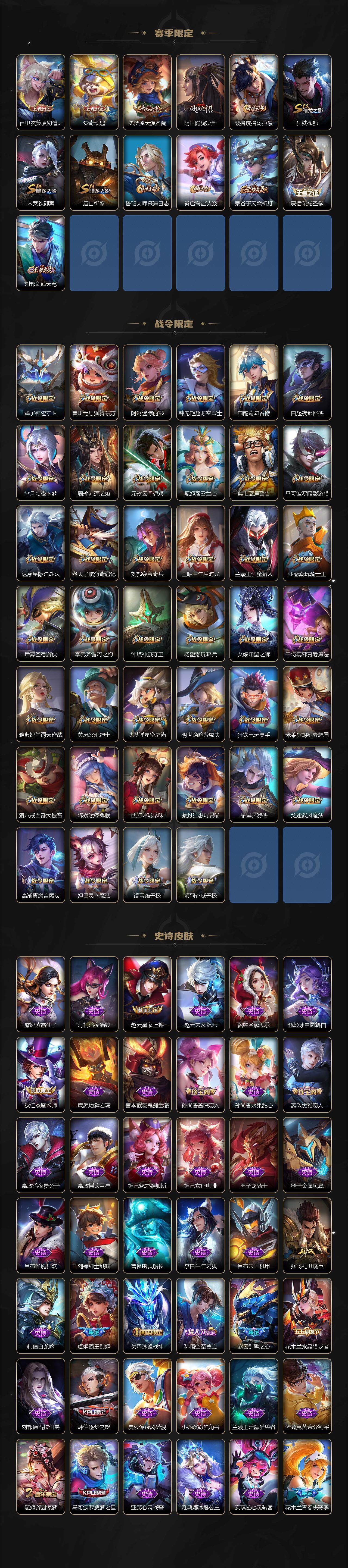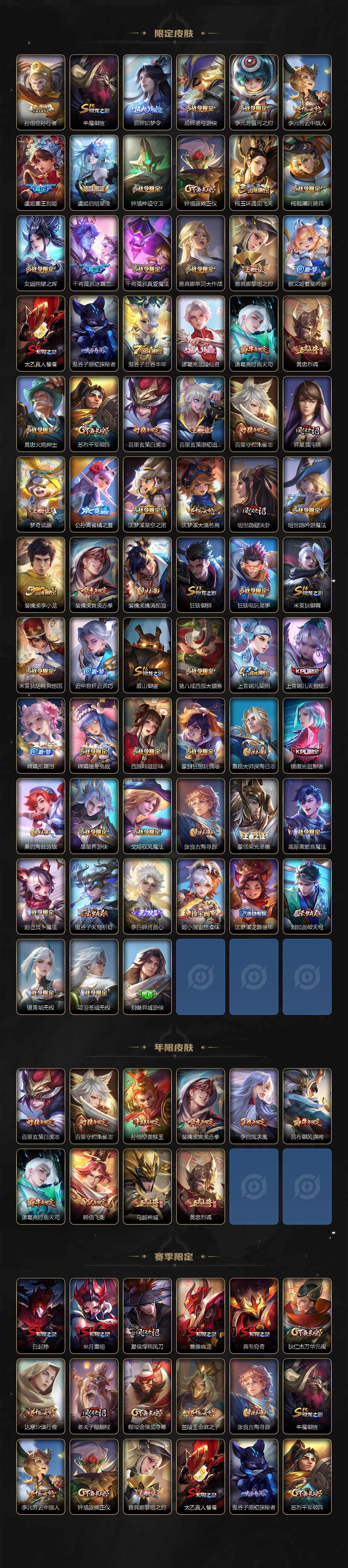 【限定皮肤】:白起狰,狄仁杰阴阳师,赵云皇家上将,赵云引擎之心,赵云百木心枪,墨子神迹守卫,嬴政优雅恋人,孙尚香蔷薇恋人,鲁班七号狮舞东方,庄周高山流水,高渐离死亡摇滚,高渐离玩趣恶龙,阿轲迷踪丽影,钟无艳超时空战士,孙膑天狼运算者,扁鹊奇幻香踪,白起夜都怪侠,芈月重明,芈月幻夜卜梦,吕布天魔缭乱,吕布御风骁将,周瑜赤莲之焰,元歌云间偶戏,元歌无心,夏侯惇朔风刀,甄姬游园惊梦,甄姬落雪兰心,曹操烛龙,典韦穷奇,典韦蓝屏警告,马可波罗逐梦之星,马可波罗暗影游猎,马可波罗深海之息,狄仁杰魔术师,狄仁杰万华元夜,达摩星际陆战队,达摩沙漠行僧,项羽海滩派对,老夫子醍醐杖,老夫子航海奇遇记,关羽冰锋战神,貂蝉遇见胡旋,程咬金演武夺筹,露娜启示之音,刘邦夺宝奇兵,韩信逐梦之影,韩信飞衡,韩信傲雪梅枪,王昭君午后时光,兰陵王驯魔猎人,兰陵王金庭之子,花木兰青春决赛季,花木兰默契交锋,不知火舞绯月行,橘右京枫霜尽,亚瑟潮玩骑士王,孙悟空美猴王,孙悟空至尊宝,孙悟空大圣娶亲,孙悟空零号赤焰,孙悟空孙行者,牛魔御旌,后羿如梦令,后羿圣弓游侠,李元芳银河之约,李元芳云中旅人,虞姬霸王别姬,虞姬启明星使,钟馗神迹守卫,钟馗驱傩正仪,杨玉环遇见飞天,杨戬潮玩骑兵,女娲朔望之晖,干将莫邪冰霜恋舞曲,干将莫邪真爱魔法,雅典娜单词大作战,雅典娜黎明之约,蔡文姬繁星吟游,太乙真人饕餮,鬼谷子原初探秘者,鬼谷子五谷丰年,诸葛亮武陵仙君,诸葛亮时雨天司,黄忠烈魂,黄忠火炮绅士,苏烈千军破阵,百里玄策白虎志,百里玄策原初追逐者,百里守约朱雀志,弈星混沌棋,梦奇顽趣,公孙离蜜橘之夏,沈梦