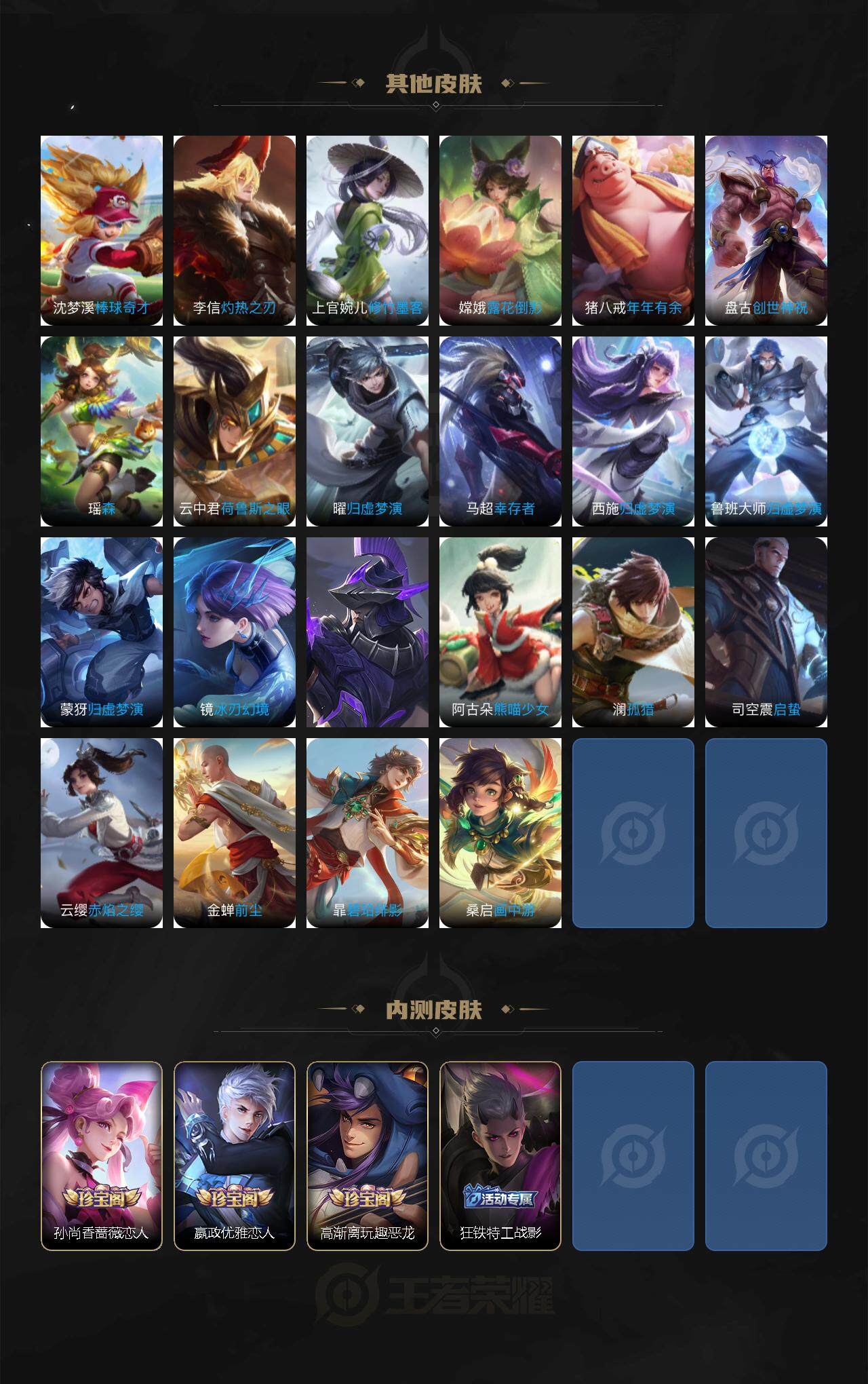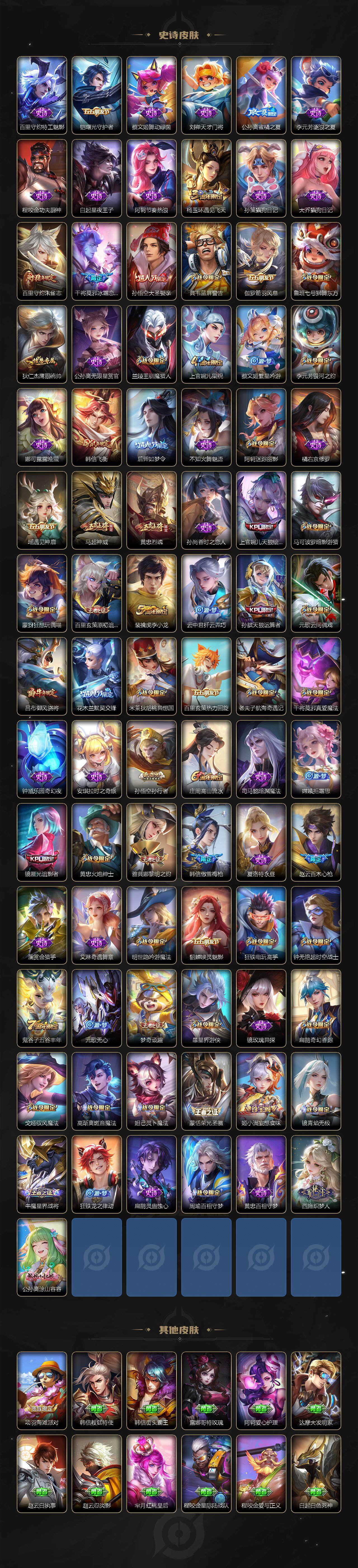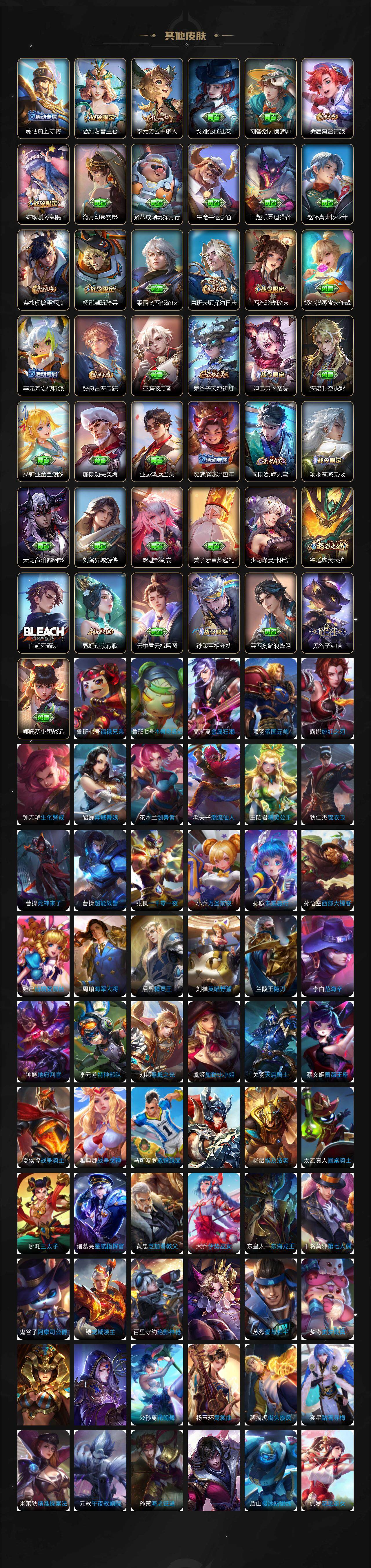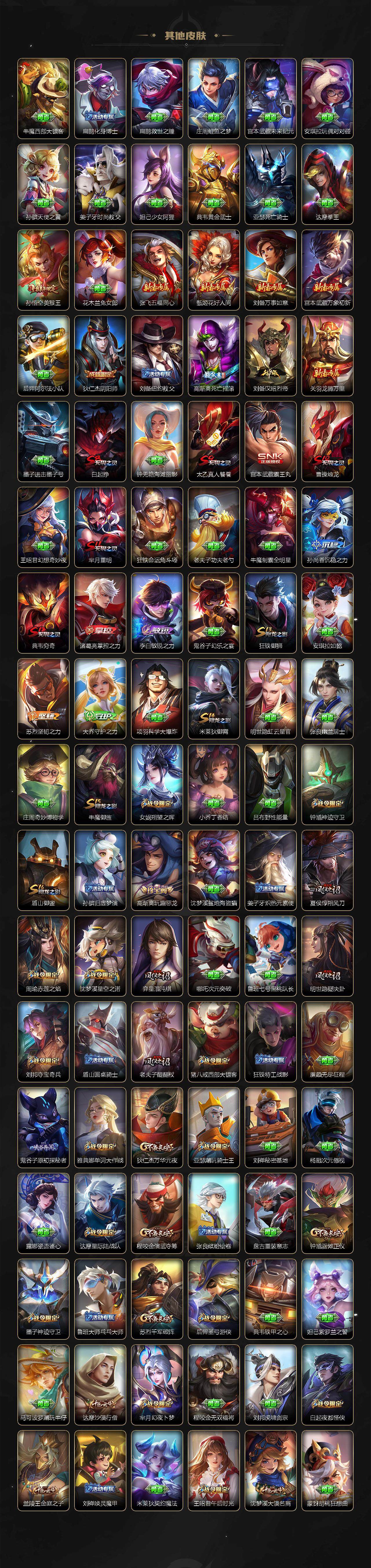 瑶遇见神鹿,娜可露露晚萤,伽罗箭羽风息,李元芳逐浪之夏,不知火舞魅语,公孙离无限星赏官,大乔猫狗日记,孙策猫狗日记,阿轲节奏热浪,露娜紫霞仙子,诸葛亮黄金分割率,韩信白龙吟,孙尚香时之恋人,阿轲暗夜猫娘,雅典娜冰冠公主,吕布末日机甲,橘右京修罗,墨子龙骑士,嬴政摇滚巨星,刘禅绅士熊喵,刘禅天才门将,白起星夜王子,安琪拉心灵骇客,安琪拉时之奇旅,程咬金功夫厨神,刘邦德古拉伯爵,兰陵王暗隐猎兽者,曹操幽灵船长,宫本武藏鬼剑武藏,司马懿暗渊魔法,亚瑟心灵战警,钟馗乐园奇幻夜,蔡文姬舞动绿茵,廉颇地狱岩魂,小乔缤纷独角兽,夏侯惇乘风破浪,花木兰水晶猎龙者,铠曙光守护者,百里玄策热力回旋,墨子金属风暴,百里玄策原初追逐者,吕布圣诞狂欢,貂蝉圣诞恋歌,百里守约特工魅影,嬴政暗夜贵公子,嫦娥拒霜思,雅典娜黎明之约,李白千年之狐,夏洛特永昼,澜赏金猎手,艾琳奇遇舞章,貂蝉唤灵魅影,镜玫瑰异探,高渐离燃音魔法