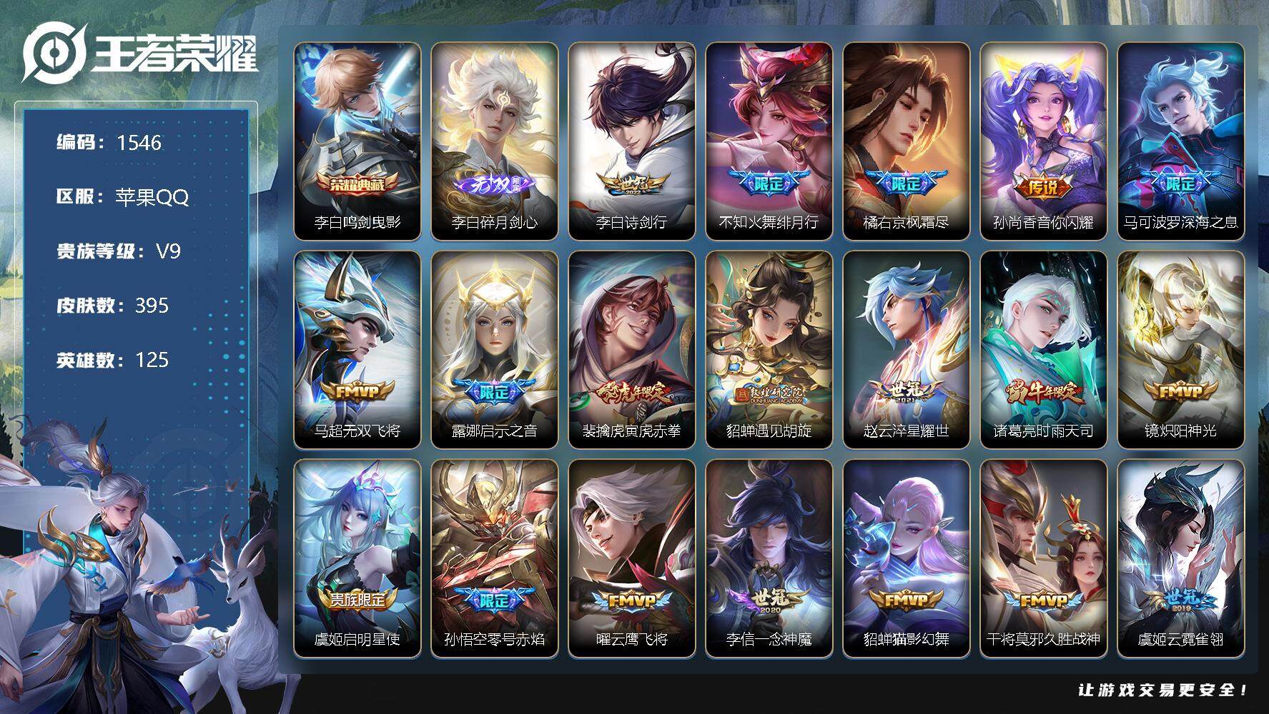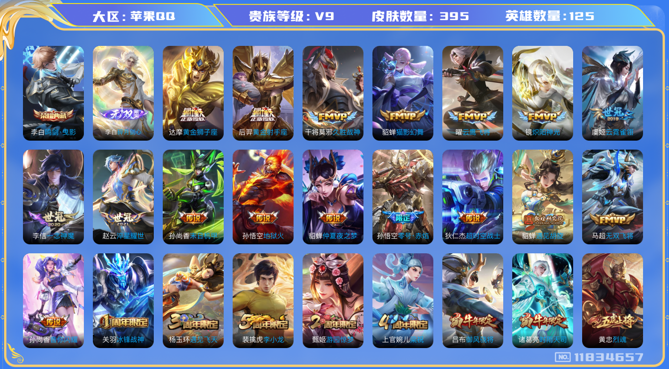 [11834657]【商品标题】:苹果Q-V9-最强王者段位-125英雄-395皮肤-1典藏-0珍品无双-1无双-0珍品传说-29传说-126史诗
