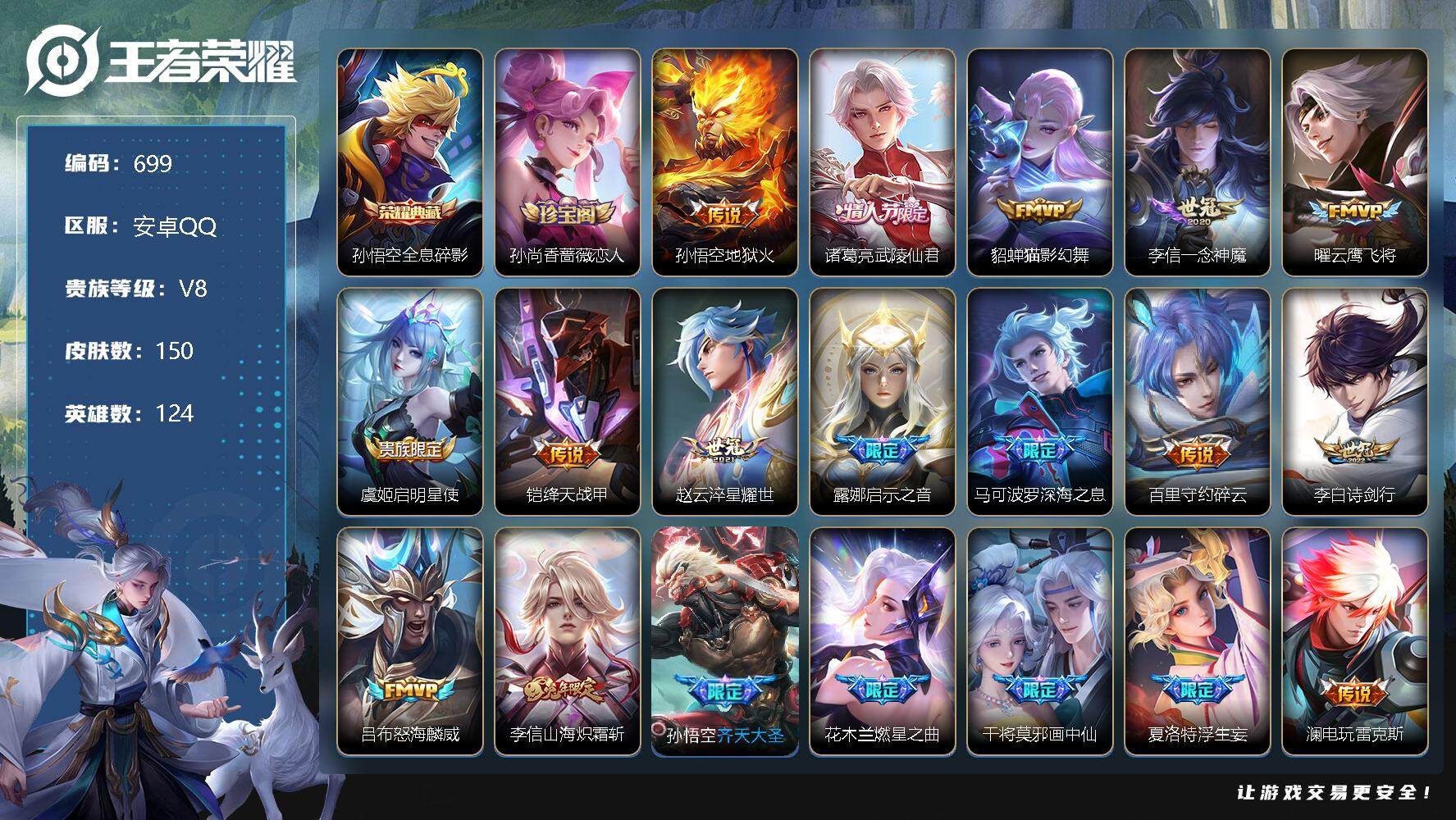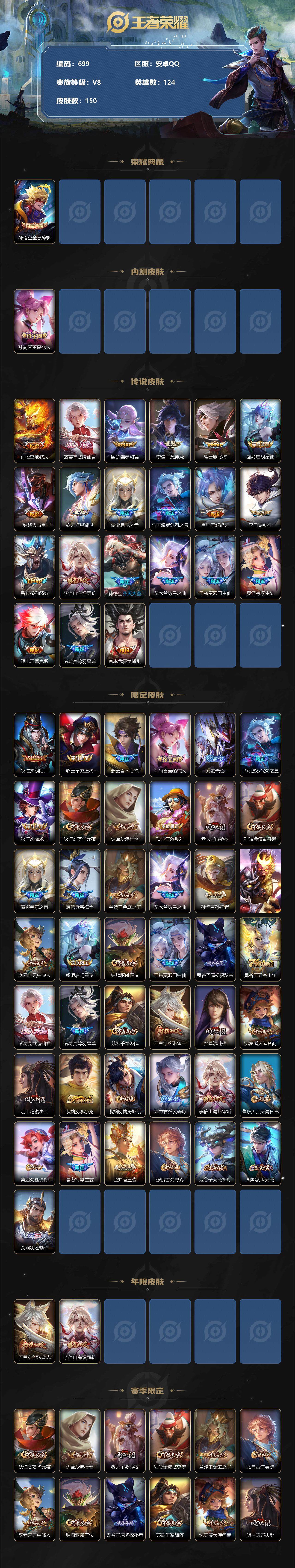 [11834943]【商品标题】:安卓Q-V8-至尊星耀V段位-124英雄-150皮肤-1典藏-0珍品无双-0无双-0珍品传说-21传说-35史诗