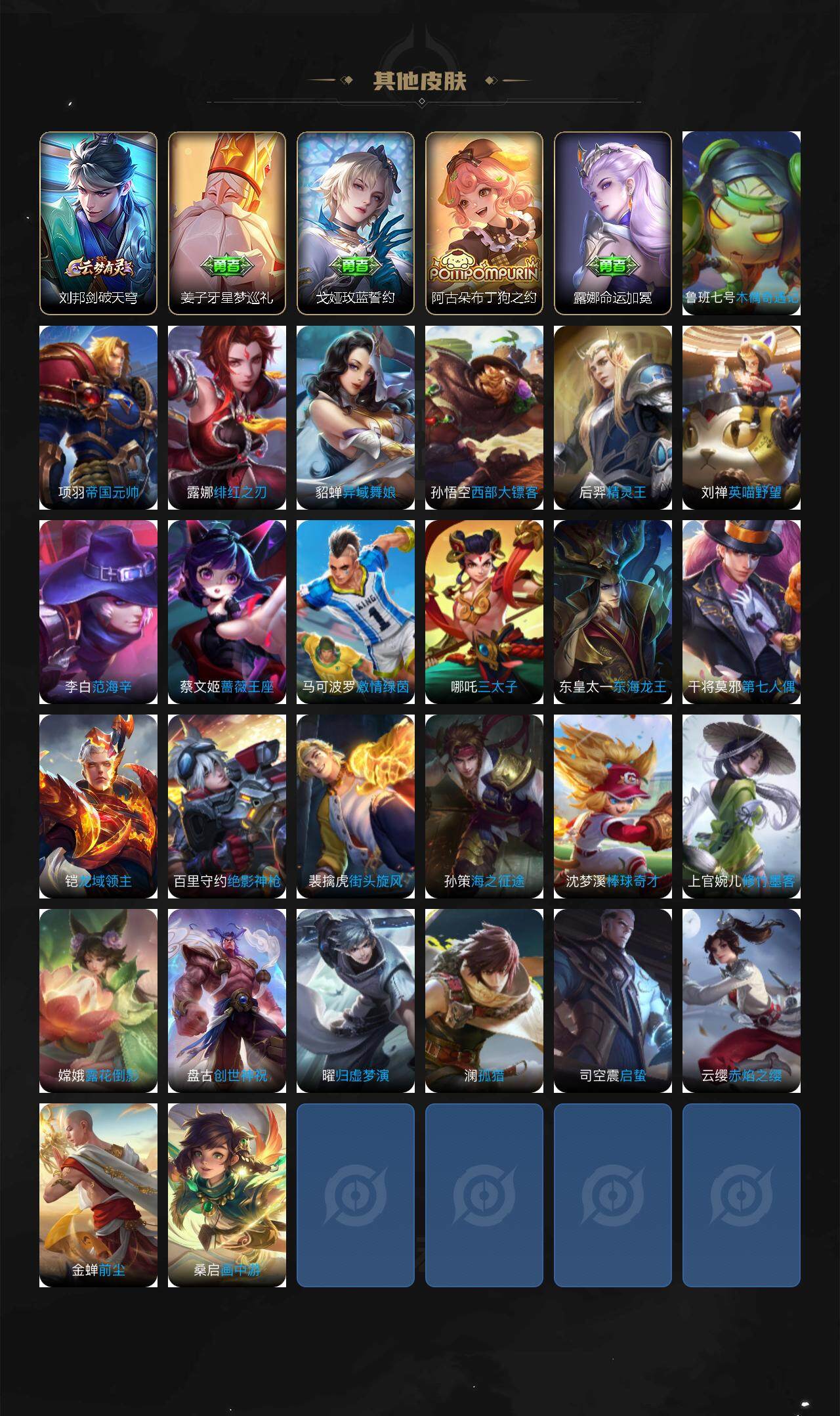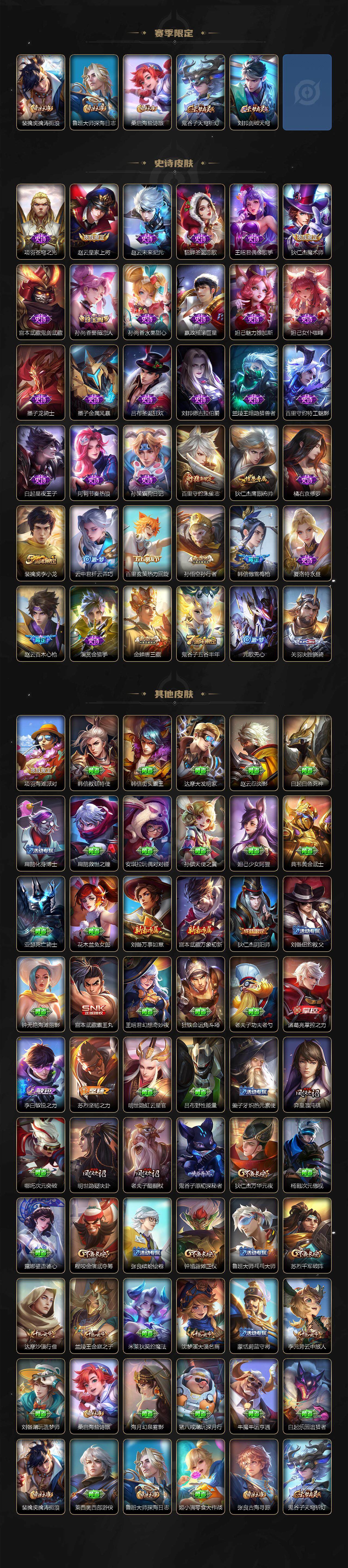 【史诗皮肤】:项羽苍穹之光,赵云皇家上将,赵云未来纪元,貂蝉圣诞恋歌,王昭君偶像歌手,狄仁杰魔术师,宫本武藏鬼剑武藏,孙尚香蔷薇恋人,孙尚香水果甜心,嬴政摇滚巨星,妲己魅力维加斯,妲己女仆咖啡,墨子龙骑士,墨子金属风暴,吕布圣诞狂欢,刘邦德古拉伯爵,兰陵王暗隐猎兽者,百里守约特工魅影,白起星夜王子,阿轲节奏热浪,孙策猫狗日记,百里守约朱雀志,狄仁杰鹰眼统帅,橘右京修罗,裴擒虎李小龙,云中君纤云弄巧,百里玄策热力回旋,孙悟空孙行者,韩信傲雪梅枪,夏洛特永昼,赵云百木心枪,澜赏金猎手,金蝉唐三藏,鬼谷子