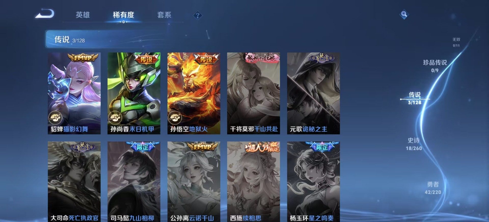 - PX_2094105-实名: 可修改 贵族等级: V7 英雄数: 125 皮肤数: 223 星传说: 未来机甲 传说皮: 炽阳神光,一念神魔,末日机甲-孙尚香,无双飞将,妄想实况 限定皮: 时雨天司,岱宗,蜜橘之夏,青龙志,至尊宝,武陵仙君,寅虎·赤拳,五谷丰年,诗剑行