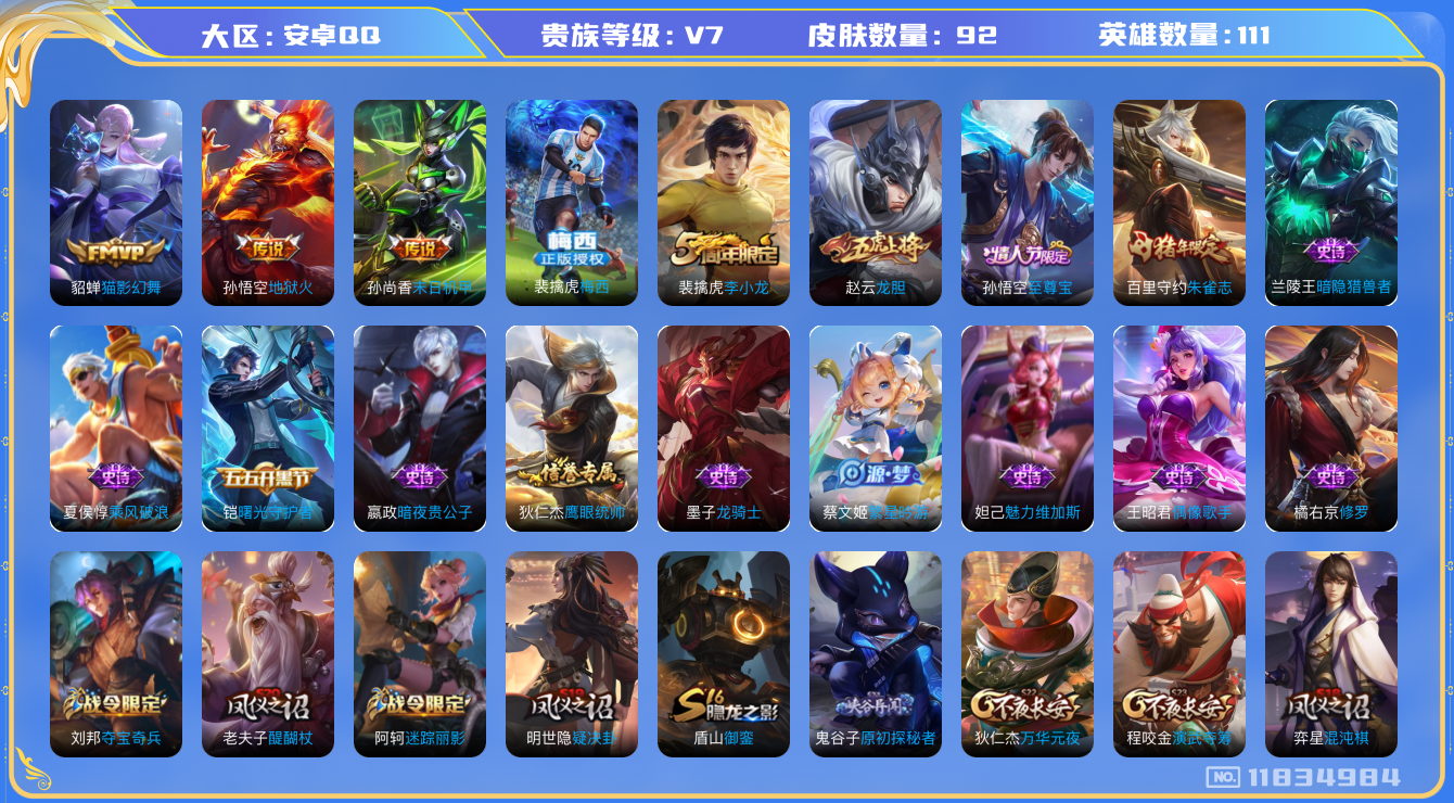 [11834984]V7 3传说 109英雄 92皮肤 可修改实名 优质装备:猫影幻舞,末日机甲-孙尚香(绿蚂蚱),地狱火 限定皮:至尊宝,梅西,龙胆,李小龙,朱雀志(守约年限) 史诗皮:偶像歌手,龙骑士(小龙虾),修罗,暗隐猎兽者,繁星吟游(呼啦呼啦),乘风破浪,曙光守护者,鹰眼统帅,暗夜贵公子,魅力维加斯
