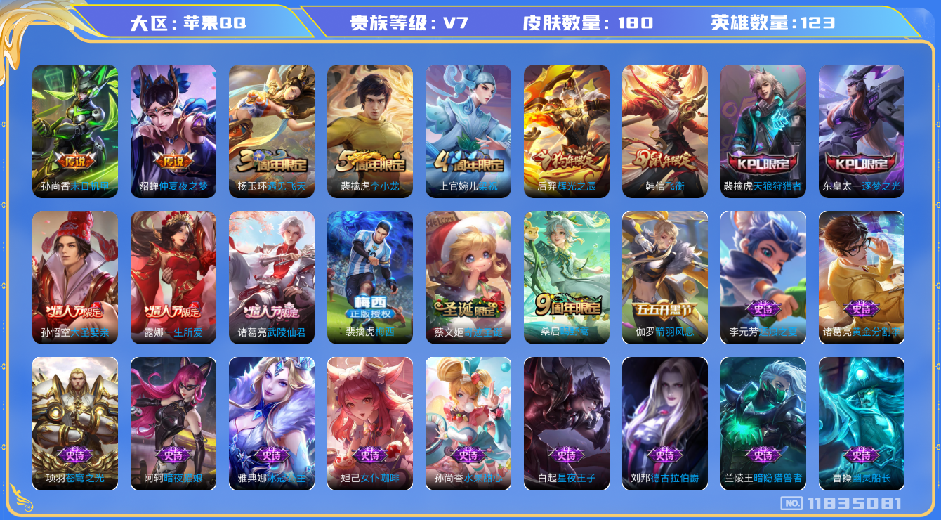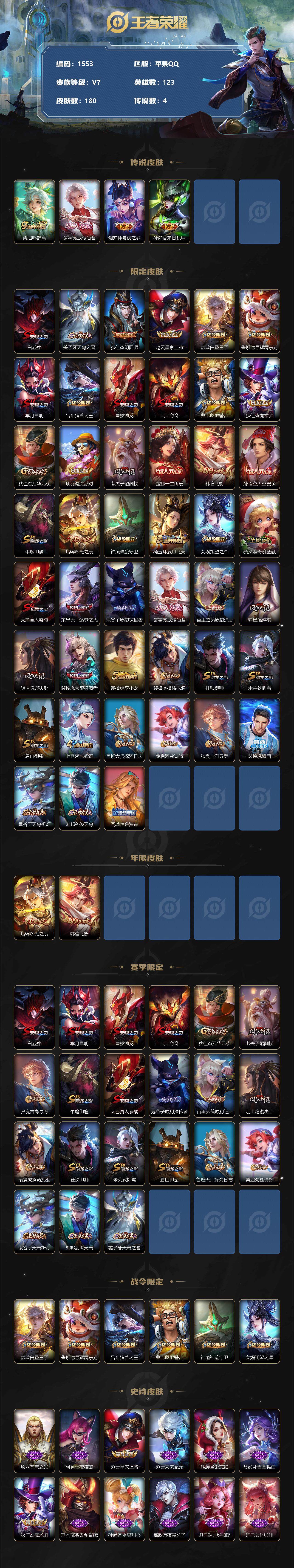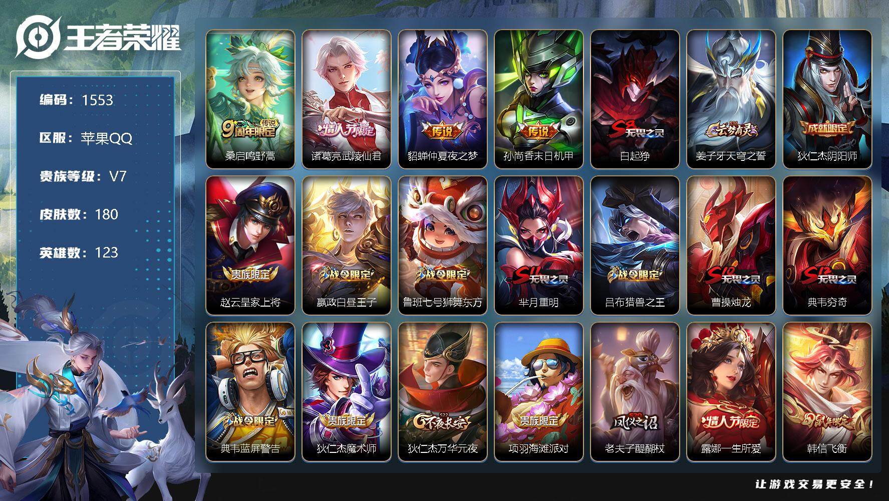 [11835081]【商品标题】:苹果Q-V2-永恒钻石IV段位-123英雄-180皮肤-0典藏-0珍品无双-0无双-0珍品传说-4传说-45史诗