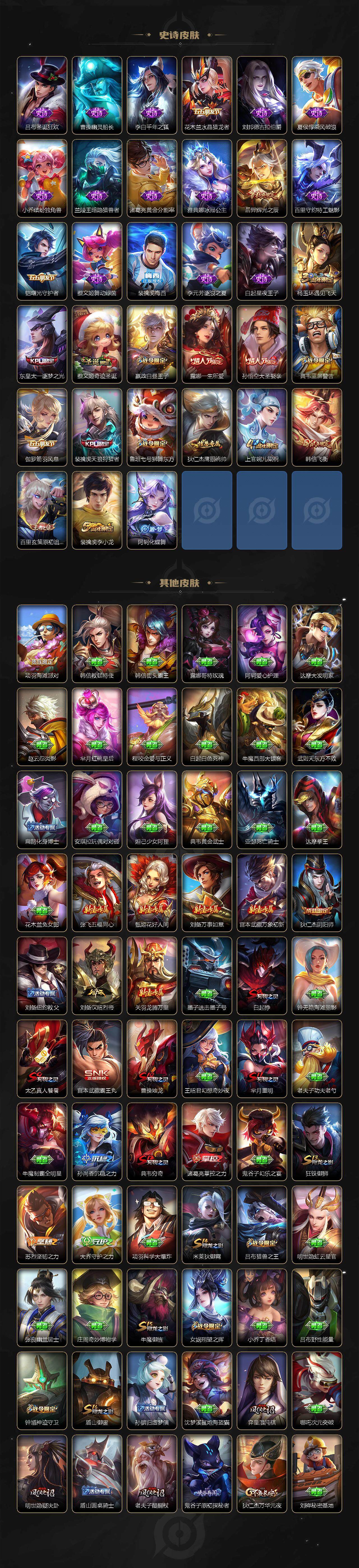 【史诗皮肤】:项羽苍穹之光,阿轲暗夜猫娘,赵云皇家上将,赵云未来纪元,貂蝉圣诞恋歌,甄姬冰雪圆舞曲,狄仁杰魔术师,宫本武藏鬼剑武藏,孙尚香水果甜心,嬴政暗夜贵公子,妲己魅力维加斯,妲己女仆咖啡,吕布圣诞狂欢,曹操幽灵船长,李白千年之狐,花木兰水晶猎龙者,刘邦德古拉伯爵,夏侯惇乘风破浪,小乔缤纷独角兽,兰陵王暗隐猎兽者,诸葛亮黄金分割率,雅典娜冰冠公主,后羿辉光之辰,百里守约特工魅影,铠曙光守护者,蔡文姬舞动绿茵,裴擒虎梅西,李元芳逐浪之夏,白起星夜王子,杨玉环遇见飞天,东皇太一逐梦之光,蔡文姬奇迹圣诞,嬴政白昼王子,露娜一生所爱,孙悟空大圣娶亲,典韦蓝屏警告,伽罗箭羽风息,裴擒虎天狼狩猎者,鲁班七号狮舞东方,狄仁杰鹰眼统帅,上官婉儿梁祝,韩信飞衡,百里玄策原初追逐者,裴擒虎李小龙,阿轲化蝶舞