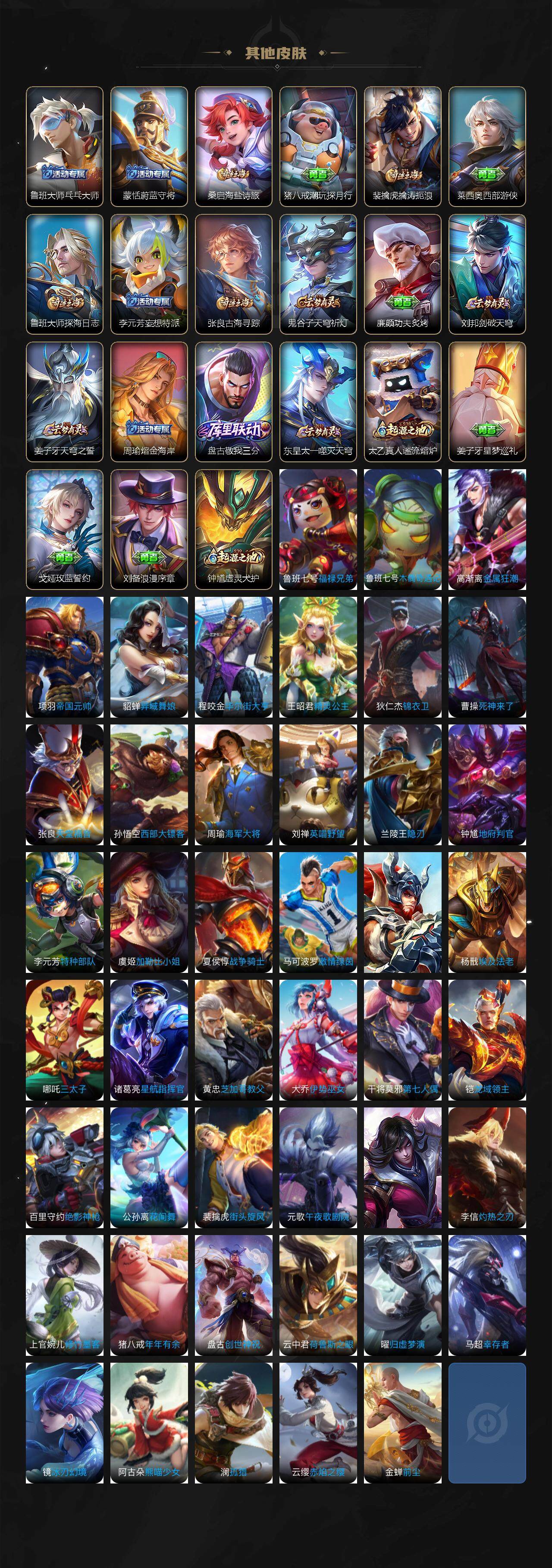 【限定皮肤】:白起狰,姜子牙天穹之誓,狄仁杰阴阳师,赵云皇家上将,嬴政白昼王子,鲁班七号狮舞东方,芈月重明,吕布猎兽之王,曹操烛龙,典韦穷奇,典韦蓝屏警告,狄仁杰魔术师,狄仁杰万华元夜,项羽海滩派对,老夫子醍醐杖,露娜一生所爱,韩信飞衡,孙悟空大圣娶亲,牛魔御旌,后羿辉光之辰,钟馗神迹守卫,杨玉环遇见飞天,女娲朔望之晖,蔡文姬奇迹圣诞,太乙真人饕餮,东皇太一逐梦之光,鬼谷子原初探秘者,诸葛亮武陵仙君,百里玄策原初追逐者,弈星混沌棋,明世隐疑决卦,裴擒虎天狼狩猎者,裴擒虎李小龙,裴擒虎擒涛扼浪,狂铁御狮,米莱狄御霄,盾山御銮,上官婉儿梁祝,鲁班大师探海日志,桑启海盐诗旅,张良古海寻踪,裴擒虎梅西,鬼谷子天穹祈灯,刘邦剑破天穹,周瑜熔金海岸
