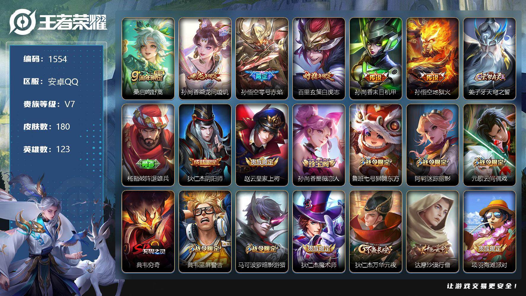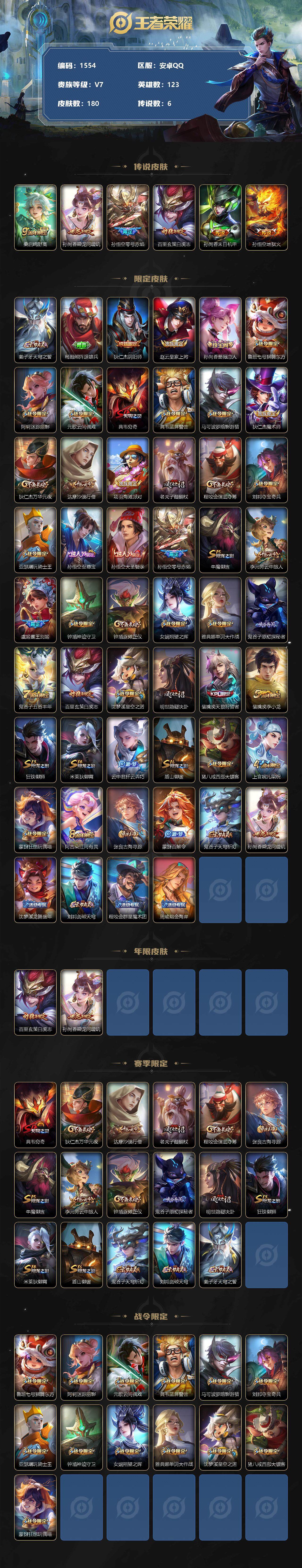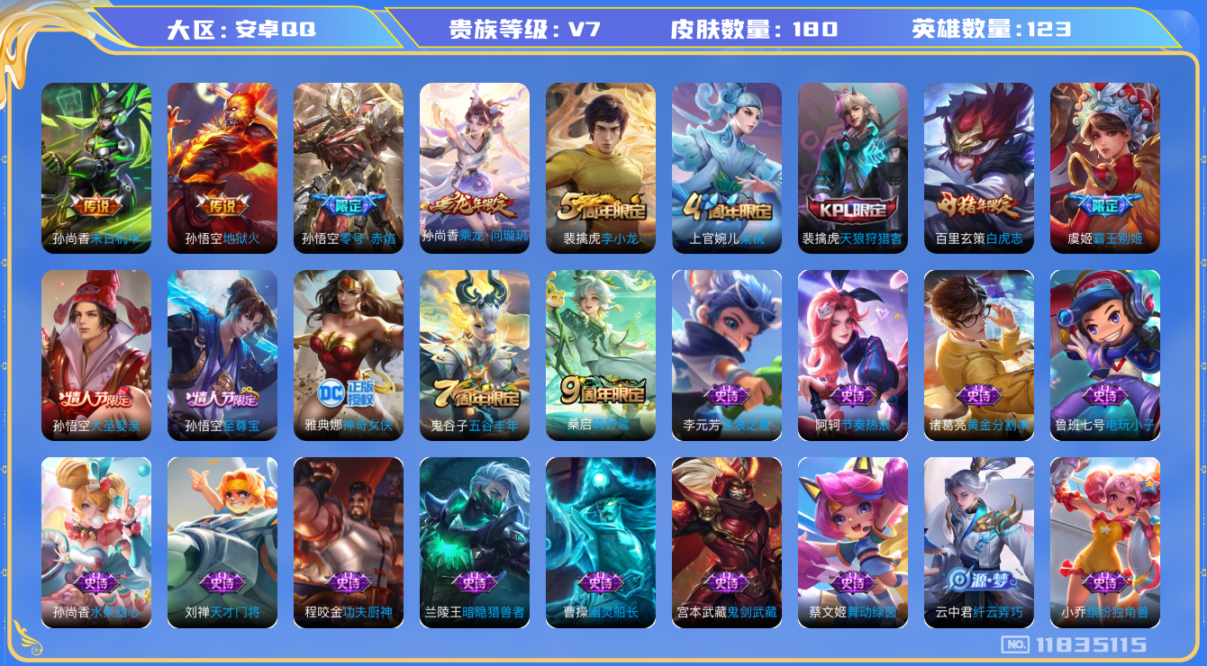 [11835115]【商品标题】:安卓Q-V7-最强王者段位-123英雄-180皮肤-0典藏-0珍品无双-0无双-0珍品传说-6传说-45史诗