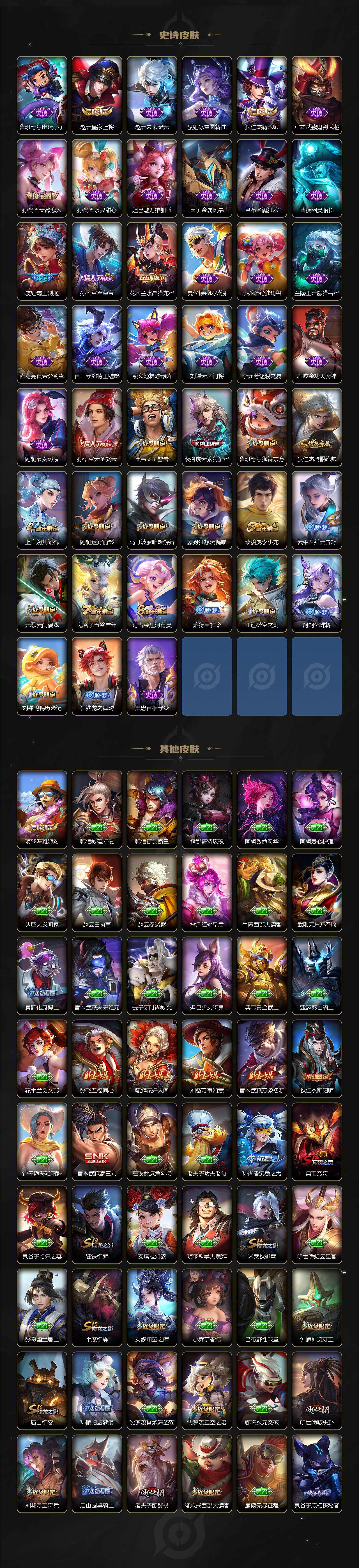 【史诗皮肤】:鲁班七号电玩小子,赵云皇家上将,赵云未来纪元,甄姬冰雪圆舞曲,狄仁杰魔术师,宫本武藏鬼剑武藏,孙尚香蔷薇恋人,孙尚香水果甜心,妲己魅力维加斯,墨子金属风暴,吕布圣诞狂欢,曹操幽灵船长,虞姬霸王别姬,孙悟空至尊宝,花木兰水晶猎龙者,夏侯惇乘风破浪,小乔缤纷独角兽,兰陵王暗隐猎兽者,诸葛亮黄金分割率,百里守约特工魅影,蔡文姬舞动绿茵,刘禅天才门将,李元芳逐浪之夏,程咬金功夫厨神,阿轲节奏热浪,孙悟空大圣娶亲,典韦蓝屏警告,裴擒虎天狼狩猎者,鲁班七号狮舞